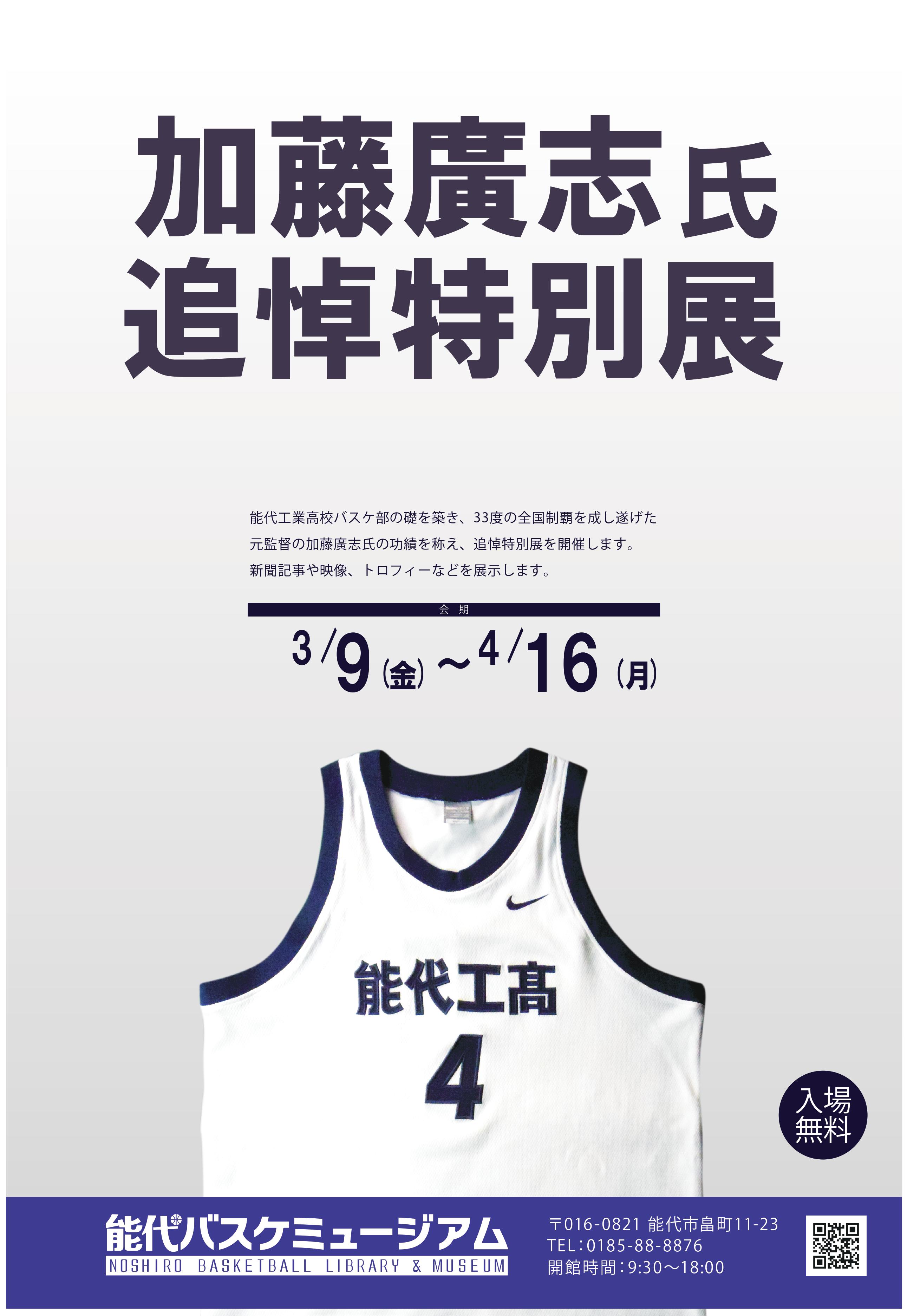 「加藤廣志氏 追悼特別展」開催のお知らせ(3/9~4/16) 投稿者: hoophall2018/03/08お知らせ 能代バスケミュージアムでは、元秋田県立能代工業高等学校バスケットボール部監督で、2018年3月4日に亡くなられた加藤廣志氏の功績を振り返る「加藤廣志氏 追悼特別展」を開催します。 期 間:3月9日(金)~4月16日(月) 時 間:午前9時30分から午後6時まで 内 容:新聞記事や映像、トロフィーなどを展示 入 場:無 料