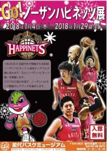 「GO!ノーザンハピネッツ展」開催のお知らせ(1/4~1/29) 投稿者: hoophall2017/12/272017/12/26お知らせ 2018年1月20日(土)、21日(日)に能代市総合体育館で開催される「秋田ノーザンハピネッツvs岩手ビッグブルズ」に合わせて、能代バスケミュージアムでは「GO!ノーザンハピネッツ展」を開催いたします。 秋田ノーザンハピネッツ様のご協力を頂き、選手のユニフォームなどの貴重なグッズを展示します。