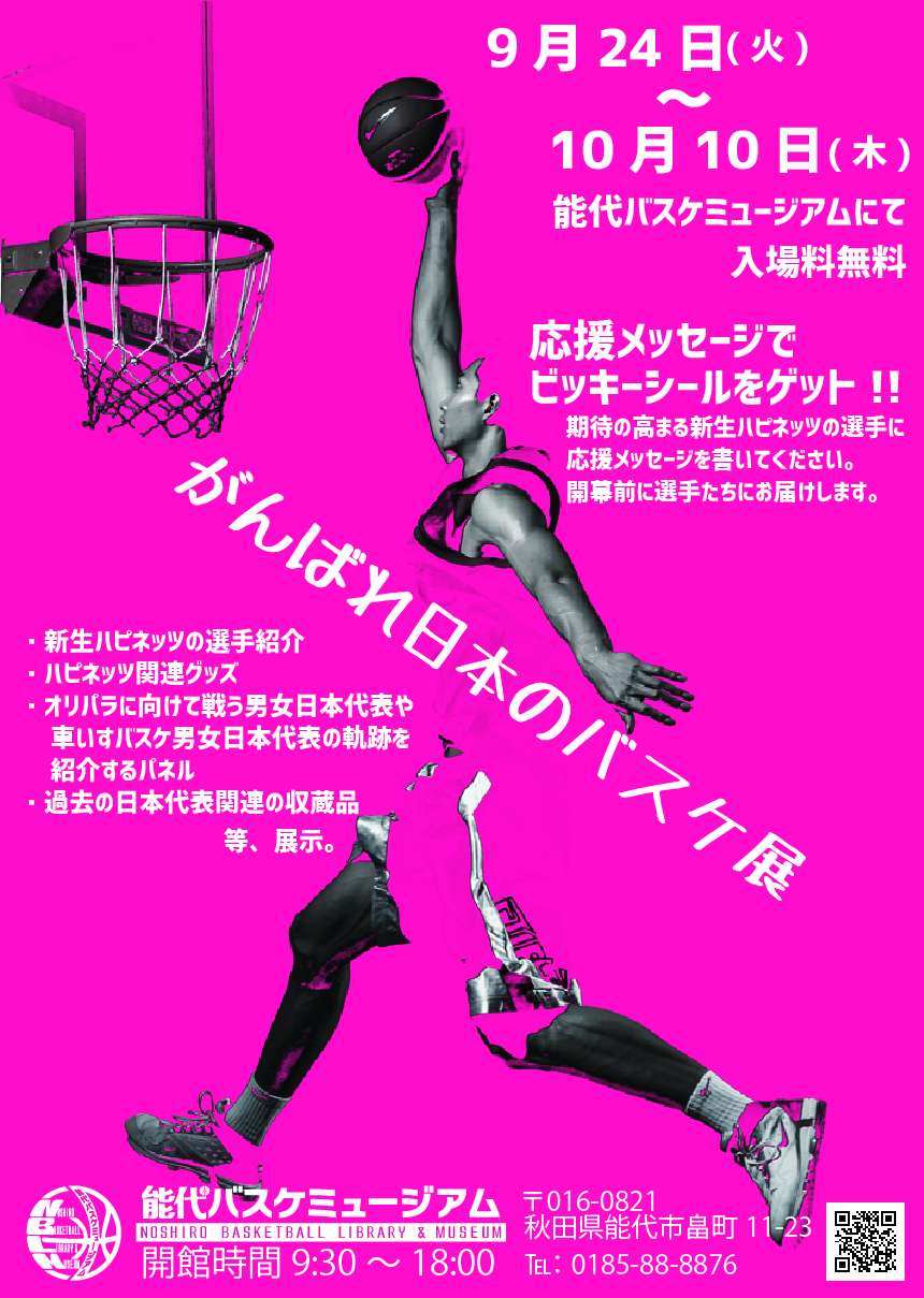 がんばれ日本のバスケ展(9/24~10/10)のお知らせ 投稿者: admin2019/09/25お知らせ 9月24日(火)昨日からがんばれ日本のバスケ展を能代バスケミュージアムにて開催しております! 新生秋田ノーザンハピネッツの選手紹介等展示中です! また、秋田ノーザンハピネッツへの応援メッセージも募集しております。 書いていただいたメッセージはすべて、秋田ノーザンハピネッツへ届けます! ご来館の際は是非お書きください! 展示は10月10日(木)までを予定しております。