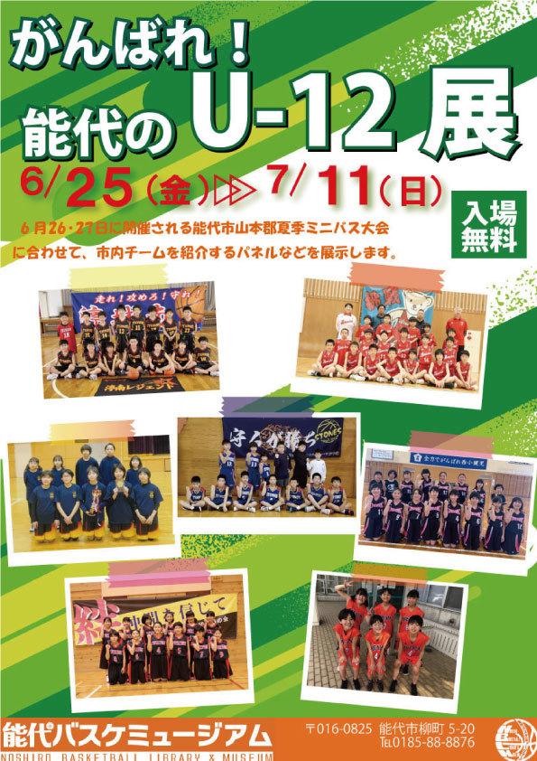 がんばれ!能代のU-12展開催(6/25~7/11)のお知らせ 投稿者: hoophall2021/06/24お知らせ 能代市山本郡夏季ミニバス大会(6月26日・27日)にあわせて、能代バスケミュージアムで6月25日(金)から7月11日(日)まで、「がんばれ!能代のU-12展」を開催します。 男女7チームの紹介パネルや、過去のミニバスの試合映像などを放映して、ミニバスを頑張る子どもたちを応援します!ぜひお気軽にお越しください。