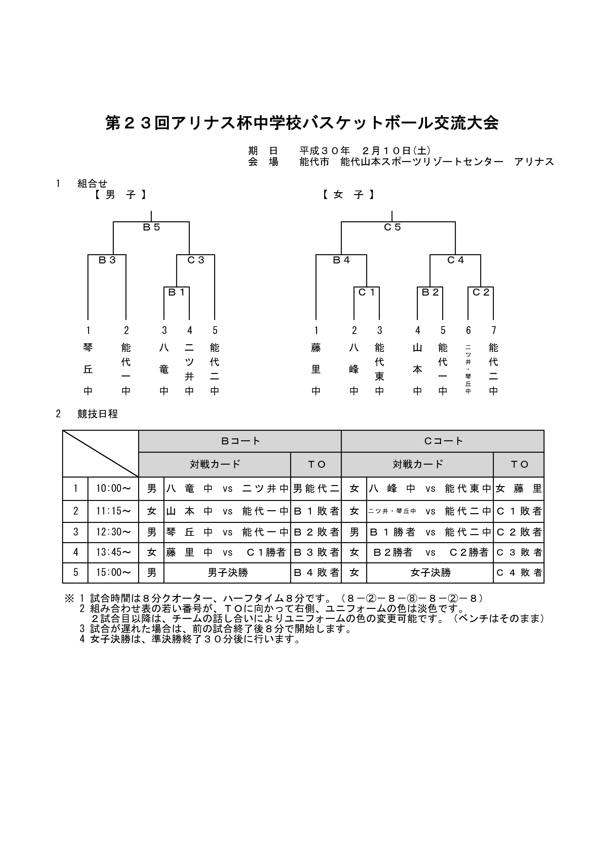 アリナス杯中学校の日程等変更のお知らせ(2/10) 投稿者: hoophall2018/02/09お知らせ 2018年2月10日(土)~11日(日)にアリナスで開催予定だった第23回アリナス杯中学校バスケットボール交流大会について、インフルエンザによる参加辞退の申出があったことから、2月10日(土)のみの開催となり、併せて組合せも変更になっていますのでお知らせします。 能代市山本郡の男子5校、女子7チームによるトーナメント戦が行われます。 詳しくは能代市山本郡バスケットボール協会HPをご覧ください。