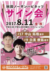 ノーザンハピネッツサイン会のお知らせ(8/11) 投稿者: hoophall2017/07/262017/07/26お知らせ 2017年8月11日(金・祝)に秋田ノーザンハピネッツの白濱僚祐選手と中山拓哉選手のサイン会を開催します。 【サイン会】 日時:2017年8月11日(金・祝)午後4時~午後5時 場所:能代バスケミュージアム 入場:無料 ※なお、選手のスケジュール等により急遽参加できなくなる場合があります。