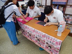 ノーザンハピネッツサイン会の報告(8/11) 投稿者: hoophall2017/08/14お知らせ 2017年8月11日、能代バスケミュージアムで秋田ノーザンハピネッツの白濱僚祐選手、中山拓哉選手のサイン会を開催しました。 当日は100名を超えるファンの方々からお越しいただき、能代の街に長蛇の列ができました! 白濱選手・中山選手、そしてご参加くださいました皆様ありがとうございました。
