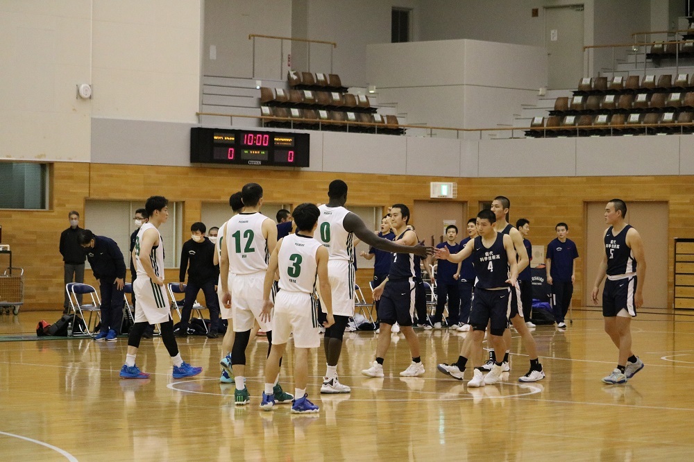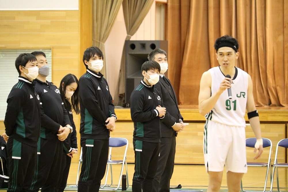 結果は、133-81でペッカーズが勝利し、会場から両チームに大きな拍手が送られました。最後に、ペッカーズを代表して斉藤選手が後輩たちへエールを送り、能代科技の相原一生主将がウインターカップでの健闘を誓いました。