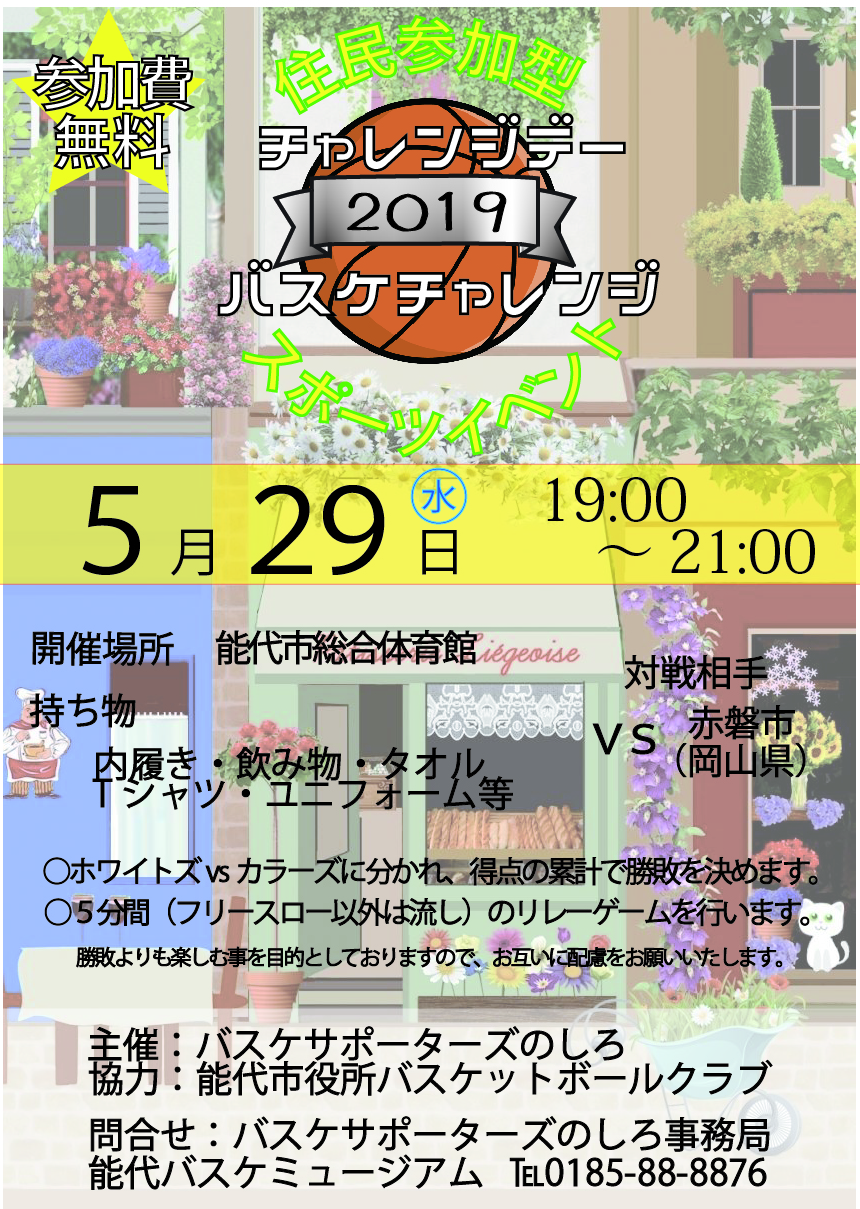 住民参加型スポーツイベント・チャレンジデー2019バスケチャレンジのお知らせ(5/29) 投稿者: admin2019/05/16お知らせ 住民参加がスポーツイベント・チャレンジデー2019バスケチャレンジが5月29日(水)19時から21時までの間、能代市総合体育館で開催されます。 詳細は下記ポスターをご参照ください。 参加者お待ちしております!