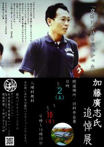 加藤廣志氏追悼展(3/2(土)~3/10(日))開催のお知らせ 投稿者: admin2019/02/20お知らせ 加藤廣志先生が亡くなられて早一年。 旧料亭金勇にて3/2(土)~3/10(日)、加藤廣志先生の追悼展が開催されます。