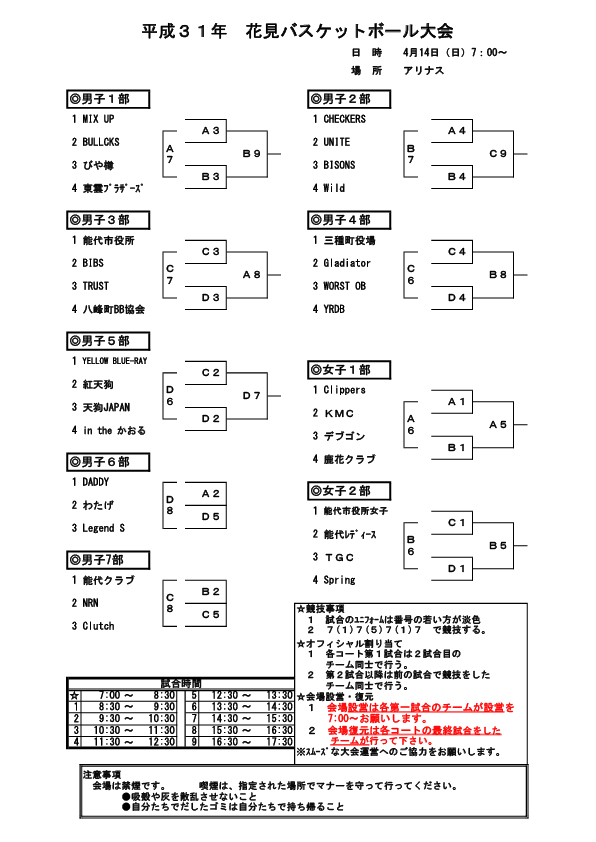 平成31年花見バスケットボール大会のお知らせ(4/14) 投稿者: admin2019/04/12お知らせ 平成31年花見バスケットボール大会が4/14(日) 8:30からアリナスで開催されます。大会の組み合わせは下記組み合わせの通りとなっております。 詳細は能代市バスケットボール協会のHPをご覧ください。