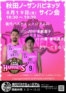 本日告知した8月19日(月)18時30分より能代バスケミュージアムで予定されている、秋田ノーザンハピネッツのサイン会について、参加選手が変更となることをお知らせいたします。