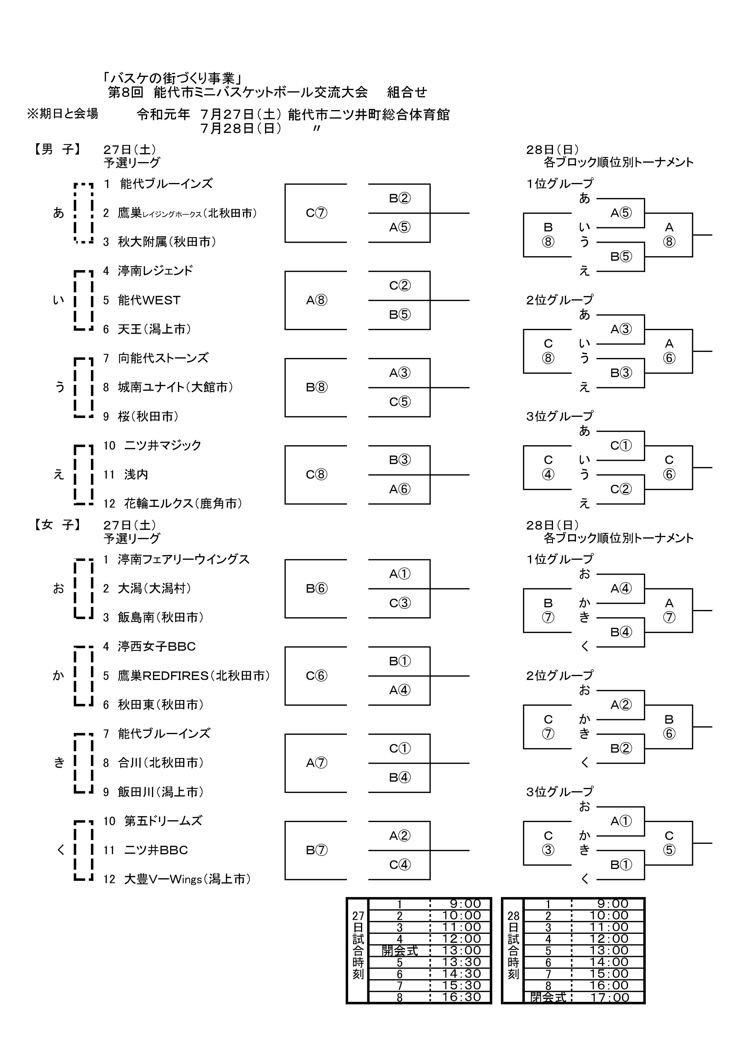 第8回能代市ミニバスケットボール交流大会のお知らせ(7/27、28) 投稿者: admin2019/07/26お知らせ 明日7月27日(土)、28日(日)の二日間に渡り、能代市二ツ井町総合体育館にて「第8回能代市ミニバスケットボール交流大会」が開催されます! 大会組み合わせは下記をご覧ください。 詳細は能代市バスケットボール協会のHPをご確認ください。