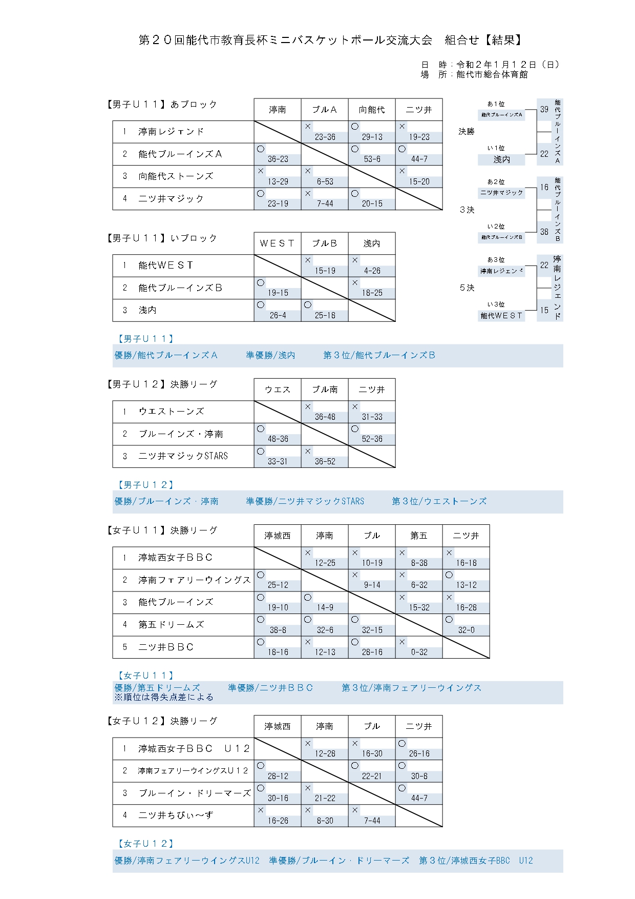 第20回能代市教育長杯ミニバスケットボール交流大会の結果は下記のとおりです。