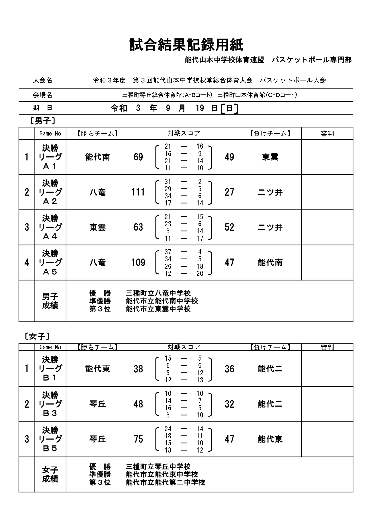 男子は優勝・準優勝、女子は優勝・準優勝・3位のチームが、11月27日(土)~28日(日)にCNAアリーナ★あきたで開催される県秋季大会の出場権を得ました。