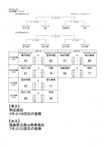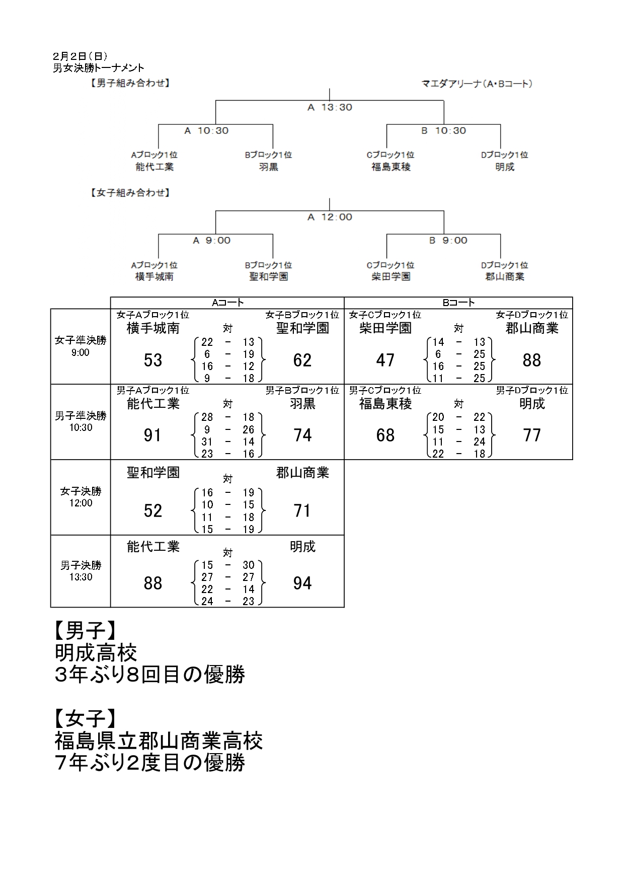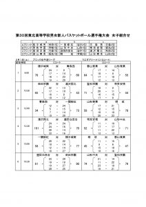 第30回東北高等学校男女新人バスケットボール選手権大会の結果(1/31-2/2) 投稿者: admin2020/02/052020/02/05お知らせ 1月31日(金)~2月2日(日)の3日間に渡り、青森県青森市のマエダアリーナで開催されていた 第30回東北高等学校男女新人バスケットボール選手権大会の結果は 男子優勝:明成高校(3年ぶり8回目の優勝) 女子優勝:福島県立郡山商業高校(7年ぶり2度目の優勝) となりました。 詳細は添付画像および秋田県バスケットボール協会のHPをご確認ください。