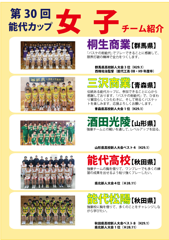 第30回能代カップ出場校紹介【女子編】 投稿者: hoophall2017/04/24お知らせ 2017年5月3日(水)~6日(土)に能代市総合体育館で、第30回能代カップが開催されます。 大会開催まで約1週間。そこで本日から今大会に参加するチームの紹介をしていきます。 第1弾は女子チーム。 男子チームは、明日からチーム毎にご紹介していきますので、観戦の参考にご覧ください。 大会日程等詳しくは以下のホームページをご覧ください。 ・能代カップ公式サイト ・能代市バスケットボール協会 ・能代市【能代カップ情報】