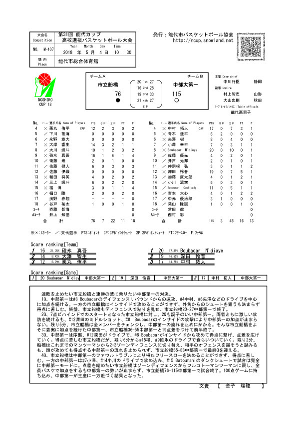 第31回能代カップ速報 市船vs中部大一(2018/5/4)第2試合