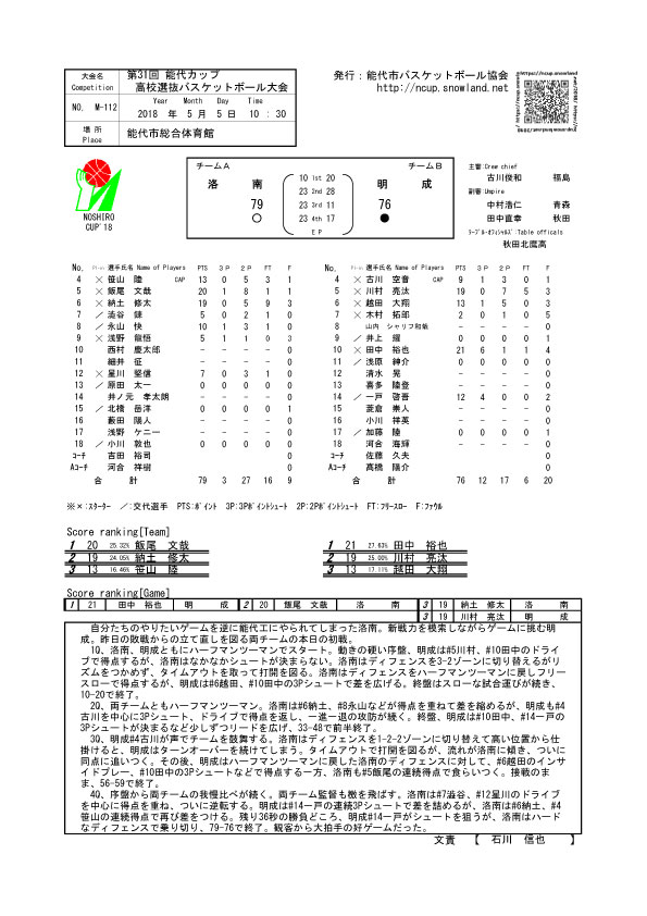 第31回能代カップ速報 洛南vs明成(2018/5/5)第2試合