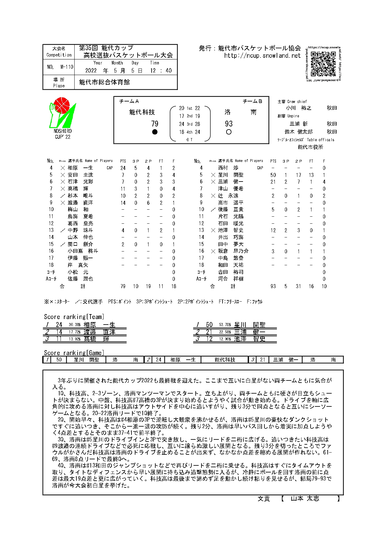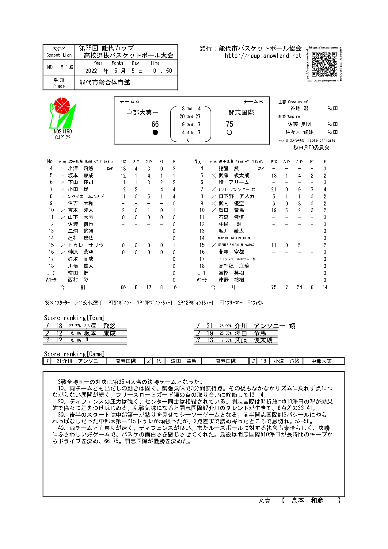 第35回能代カップ 最終日(5/5)結果 投稿者: hoophall2022/05/05お知らせ 能代カップ最終日(5/5)の結果は、以下のとおりです。 第1試合 洛南91―93市立船橋 第2試合 中部大第一66―75開志国際 第3試合 能代科技79―93洛南 【順位】 優勝 開志国際(4勝0敗) 準優勝 中部大第一(3勝1敗) 第3位 市立船橋(2勝2敗) 第4位 洛南(1勝3敗) 第5位 能代科学技術(4敗) 【優秀選手賞】 ・介川アンソニー翔(開志国際) ・澤田竜馬(開志国際) ・BASHIR FAISAL MUHAMMAD(開志国際) ・小澤飛悠(中部大第一) ・坂本康成(中部大第一) 結果は、能代カップ公式サイトでもご確認できます。
