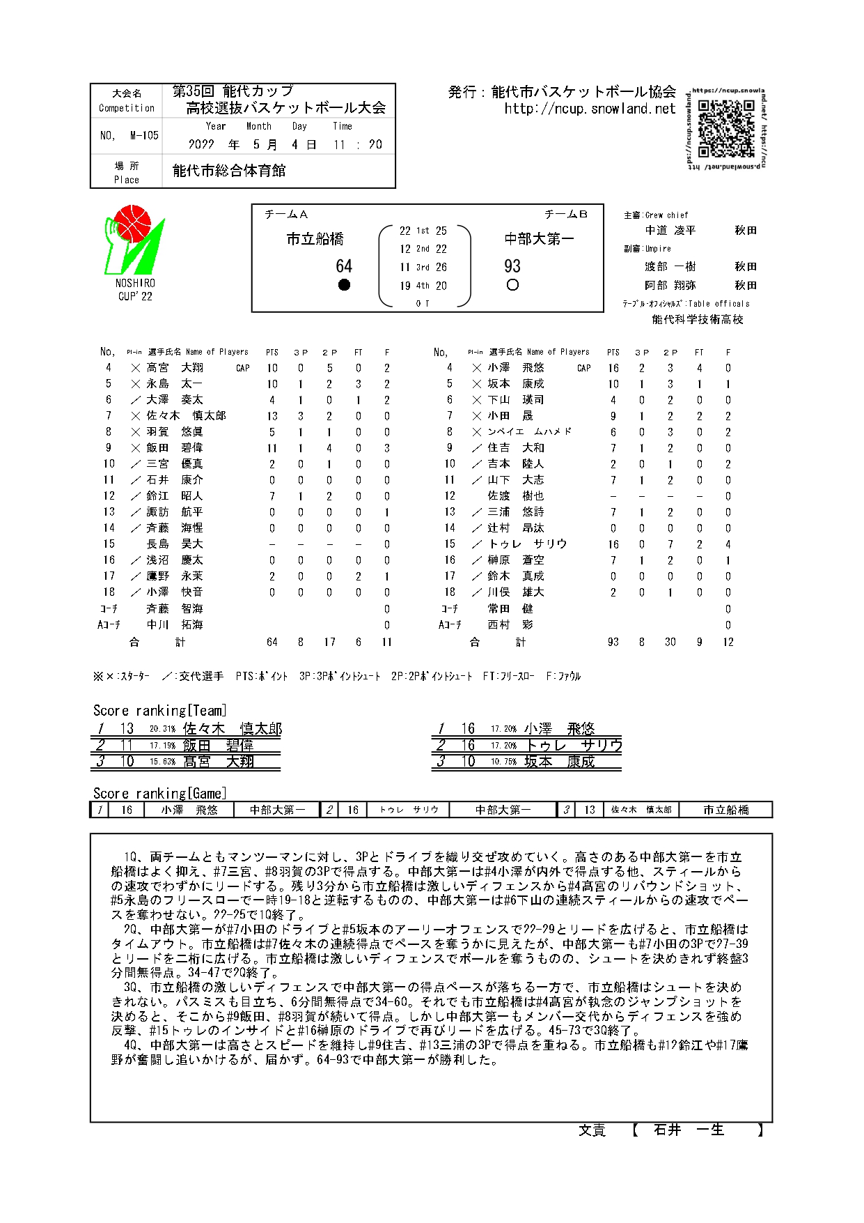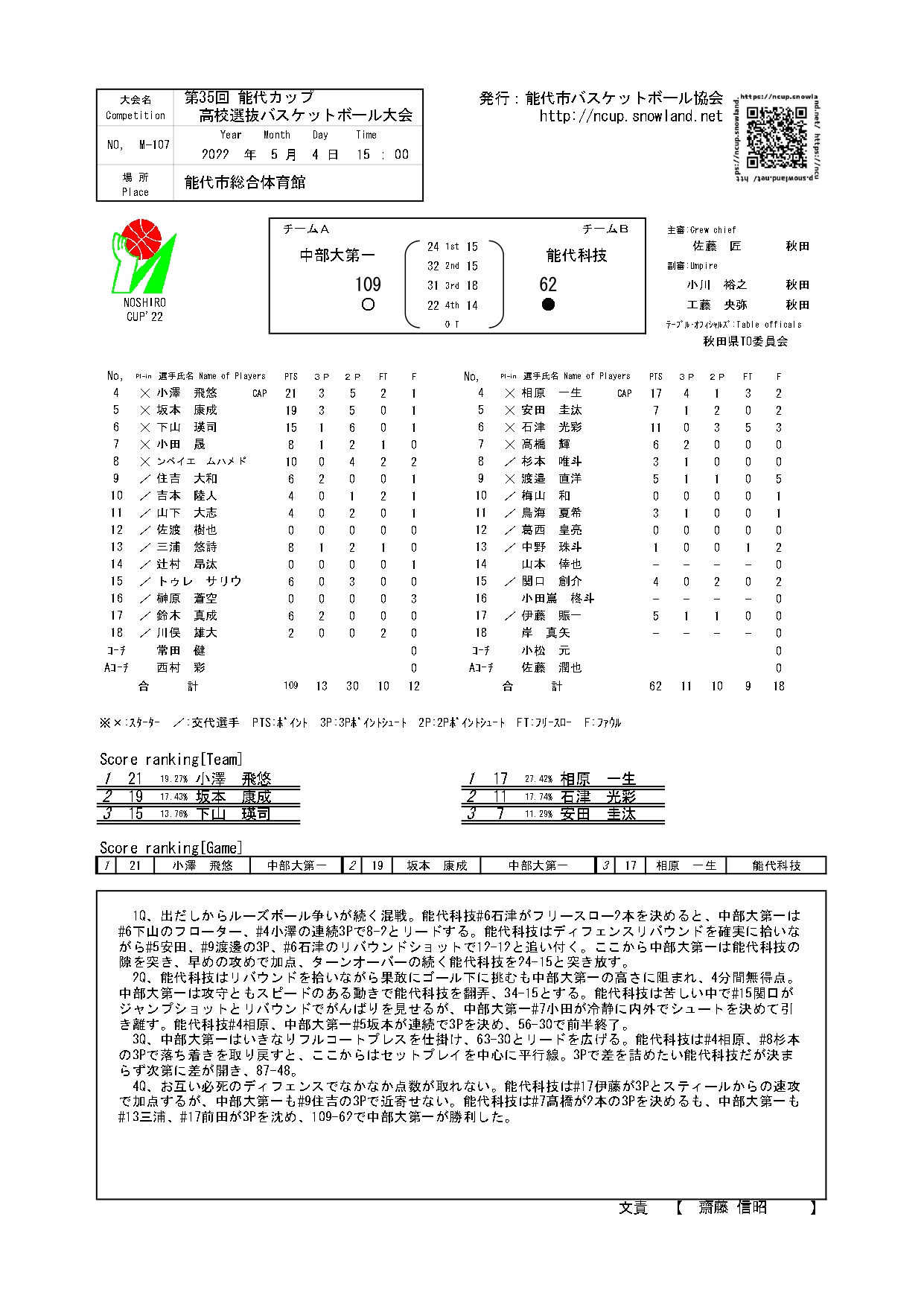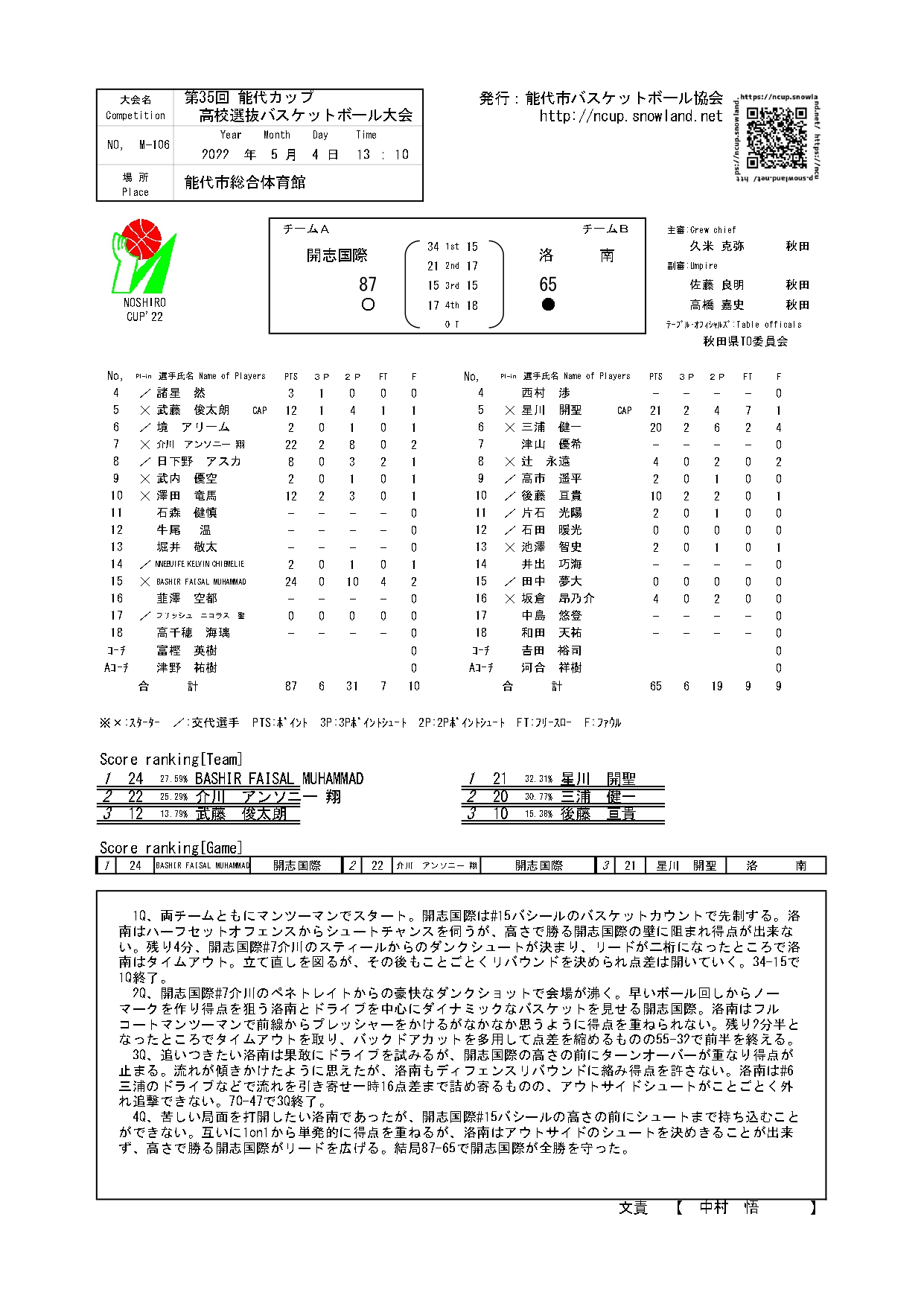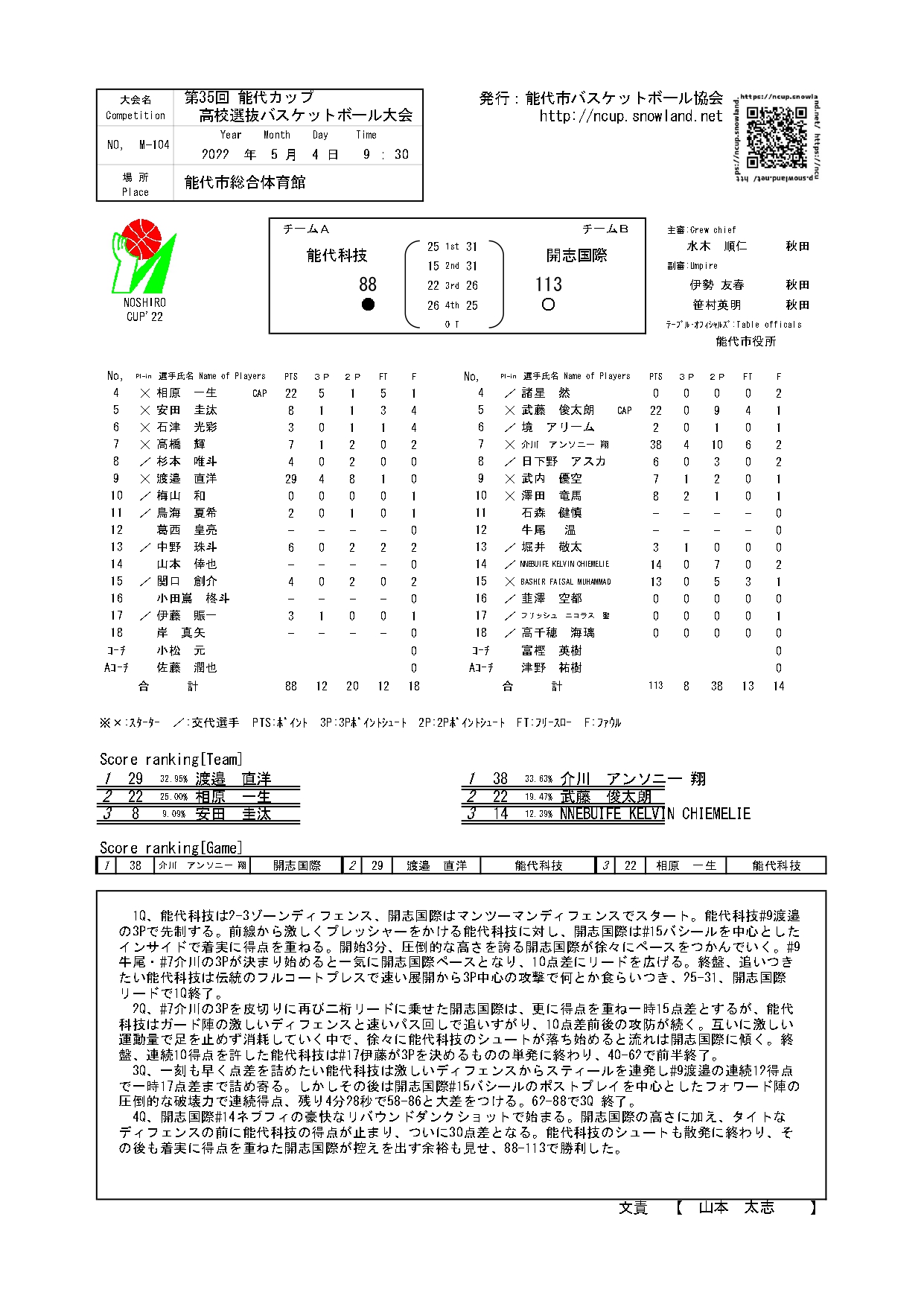 第35回能代カップ 2日目(5/4)結果 投稿者: hoophall2022/05/04お知らせ 能代カップ2日目(5/4)の結果は、以下のとおりです。 第1試合 能代科技88-113開志国際 第2試合 市立船橋64-93中部大第一 第3試合 開志国際87-65洛南 第4試合 中部大第一109-62能代科技 明日(5/5)の試合予定 9:00~10:50 洛南vs市立船橋 10:50~12:40 中部大第一vs開志国際 12:40~14:30 能代科技vs洛南 試合結果や日程は能代カップ公式サイトでもご確認できます。