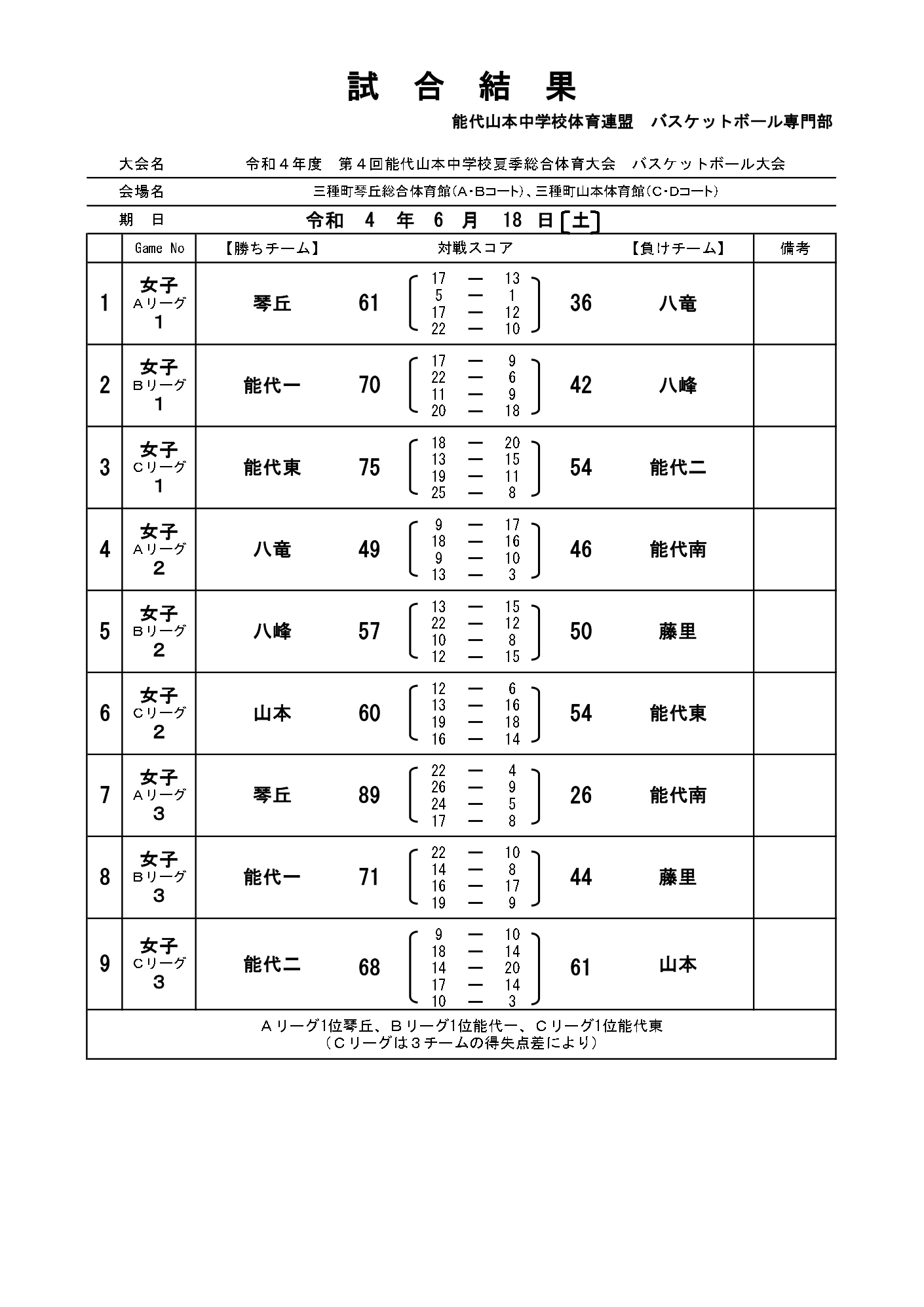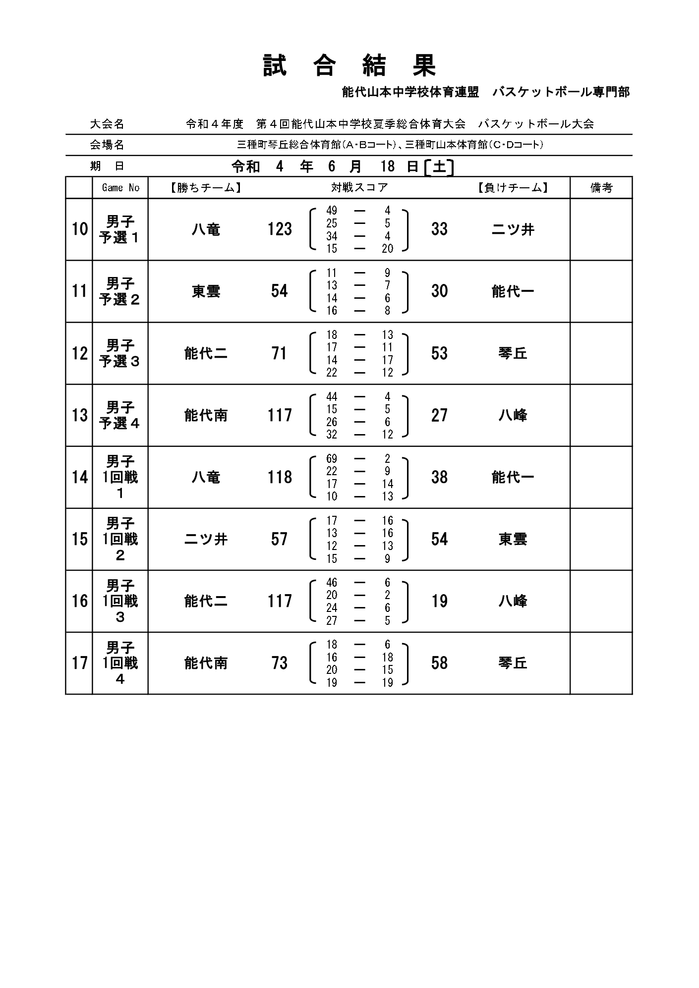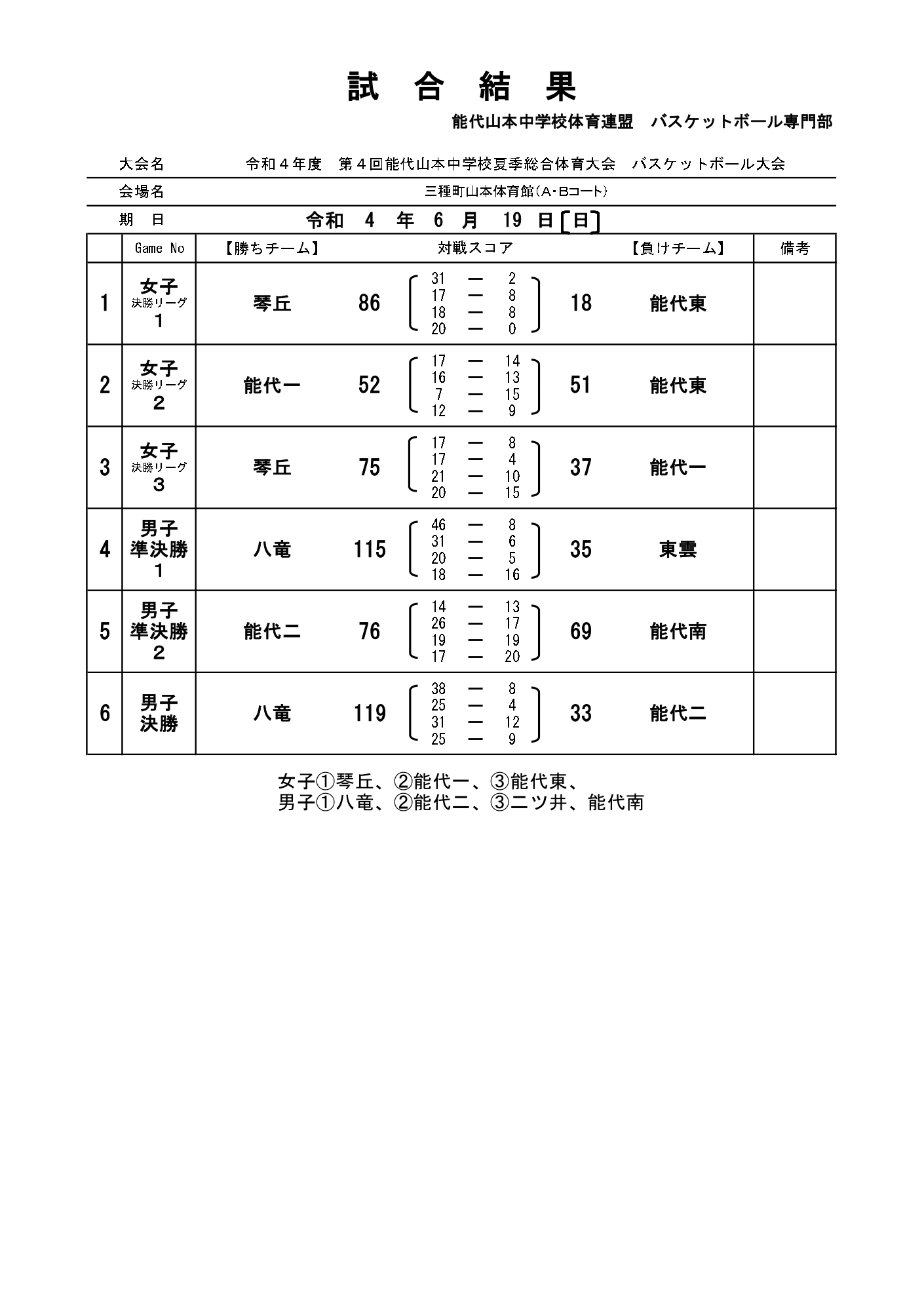 第4回能代山本中学校夏季総体結果(6/21) 投稿者: hoophall2022/06/21お知らせ 令和4年度第4回能代山本中学校夏季総合体育大会が6/18・19の2日間、三種町の琴丘総合体育館・山本体育館で開催され、男子は八竜、女子は琴丘が優勝しました。 結果は以下のとおりです。 【男子】 優勝 八竜 準優勝 能代二 第3位 二ツ井・能代南 【女子】 優勝 琴丘 準優勝 能代一 第3位 能代東 男女ともに優勝・準優勝の2校が秋田県中学総体(7/16~18・秋田市)に出場します。選手の皆さん、頑張ってください! 各試合のスコアは以下のとおりです。 ※男子準決勝1は、八竜-二ツ井です。