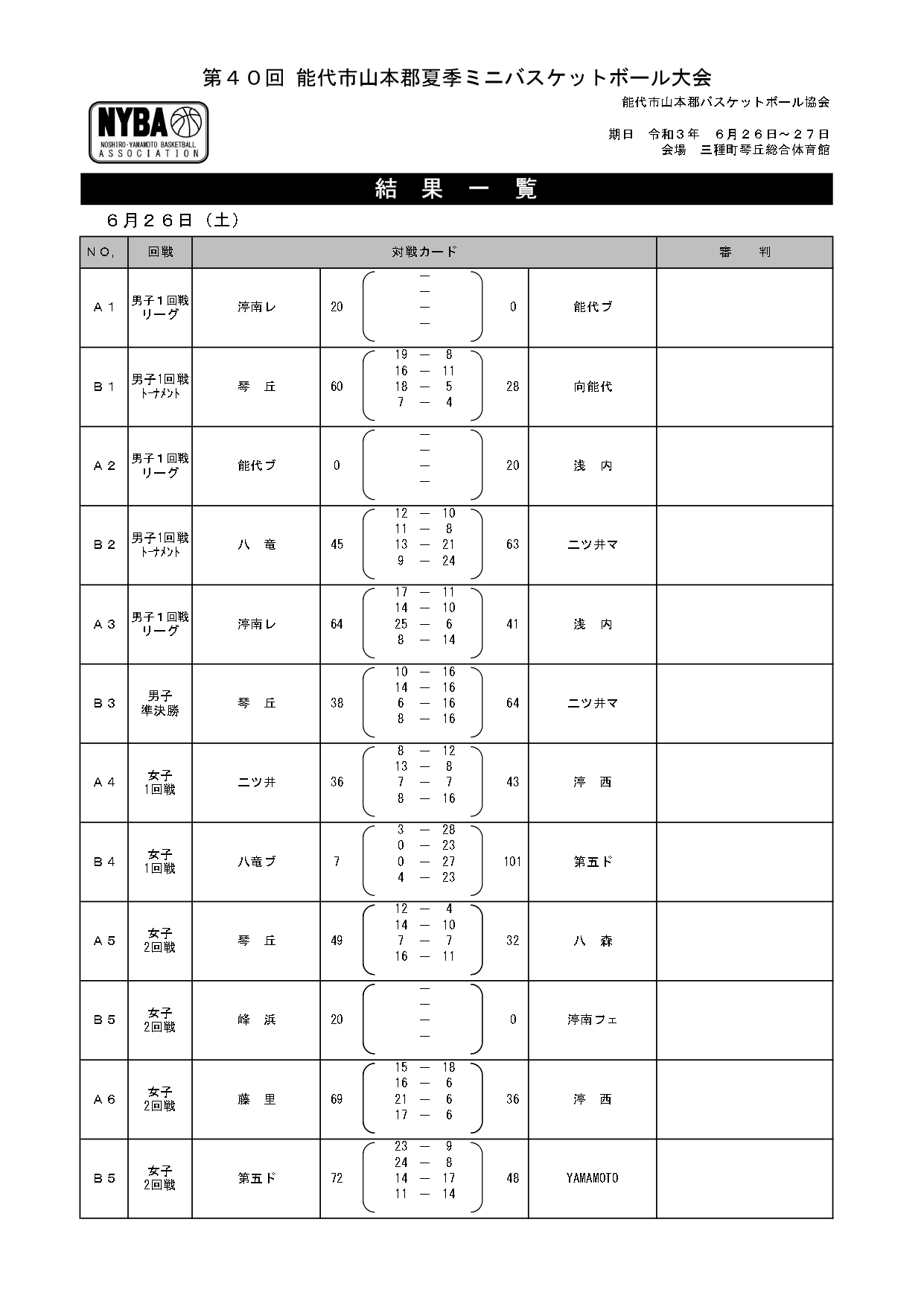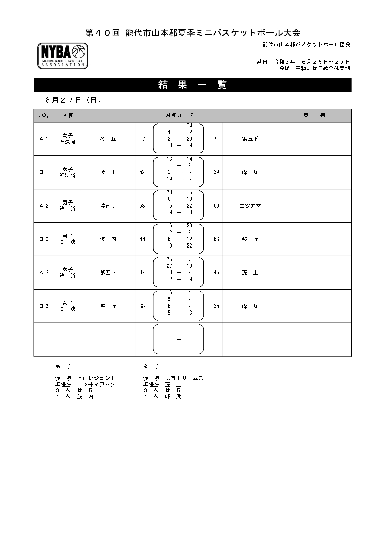 第40回能代市山本郡夏季ミニバスケットボール大会結果(6/28) 投稿者: hoophall2021/06/282021/06/28お知らせ 第40回能代市山本郡夏季ミニバスケットボール大会が6月26・27日に三種町琴丘総合体育館で開催されました。 全県大会への出場権を懸けて、男子6チーム、女子9チームが熱戦を繰り広げ、男子は渟南レジェンド、女子は第五ドリームズが優勝しました。 男女の優勝チームは、7月24・25日に由利本荘市で開催される「秋田県ミニバス夏季大会」に出場します。両チームの皆さん、頑張ってください! 試合結果は次のとおりです。 6月26日(土) 6月27日(日) 詳細は能代市山本郡バスケットボール協会公式サイトをご覧ください。