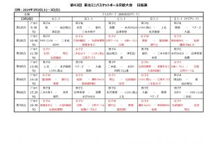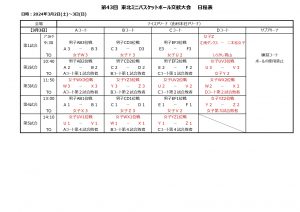 第43回東北ミニバスケットボール交歓大会組み合わせ(2/28) 投稿者: hoophall2024/02/28お知らせ 第43回東北ミニバスケットボール交歓大会が3/2、3日、秋田県由利本荘市のナイスアリーナで開催されます。 能代山本からは、能代ブルーインズ(男子)、琴丘サンフラワーキッズ(女子)が秋田県代表として出場します!6年生にとっては、ミニバス最後の大会です。選手の皆さん、頑張ってください! 一般観戦もできますので、応援よろしくお願いします。観戦の際は、内履きをご持参ください。 組み合わせは以下のとおりです。 【3/2日】 【3/3日】