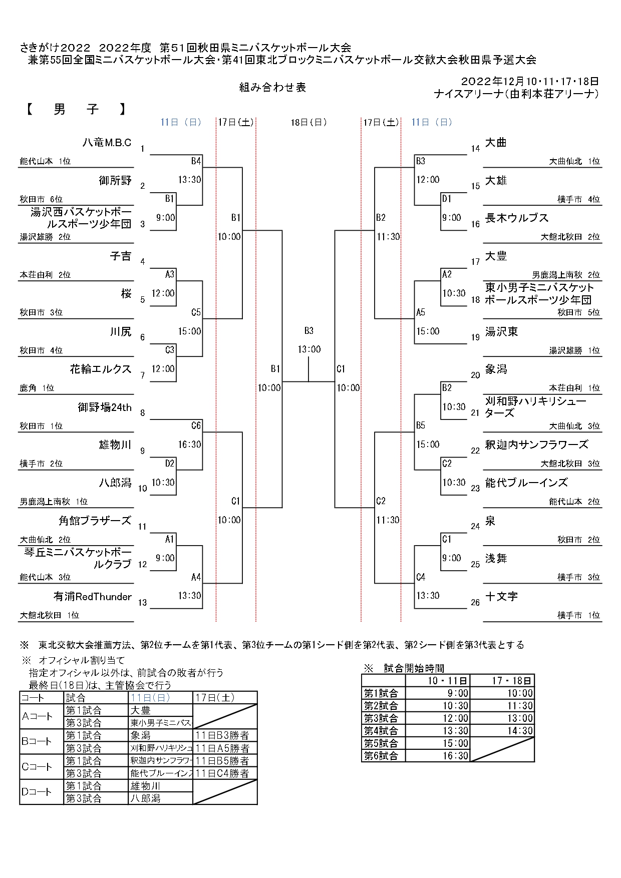 能代山本の出場チームと組み合わせは以下のとおりです。