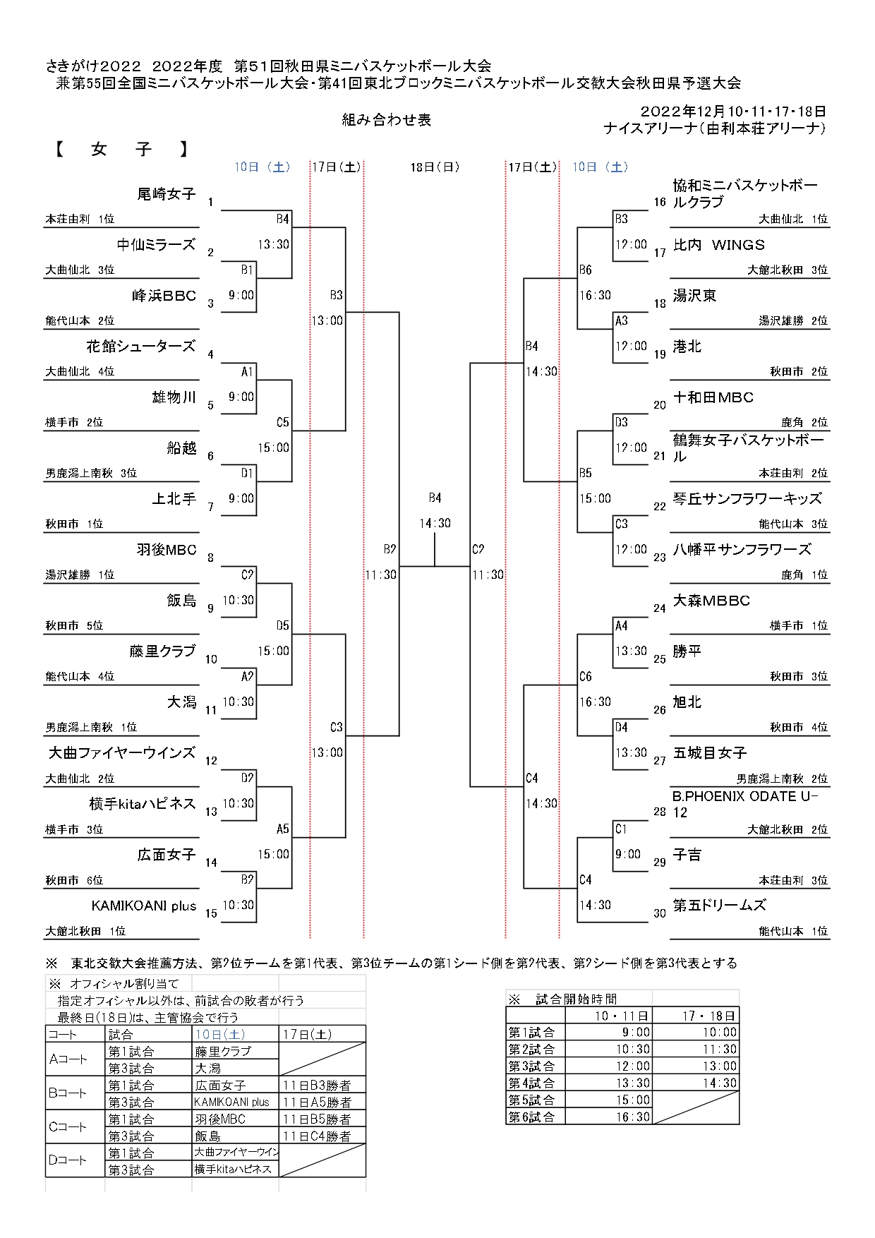 さきがけ2022 2022年度第51回秋田県ミニバスケットボール大会が12/10・11、17・18日、由利本荘市のナイスアリーナで開催されます。男子は11日、17・18日、女子は10日、17・18日の3日間にわたって試合が行われます。