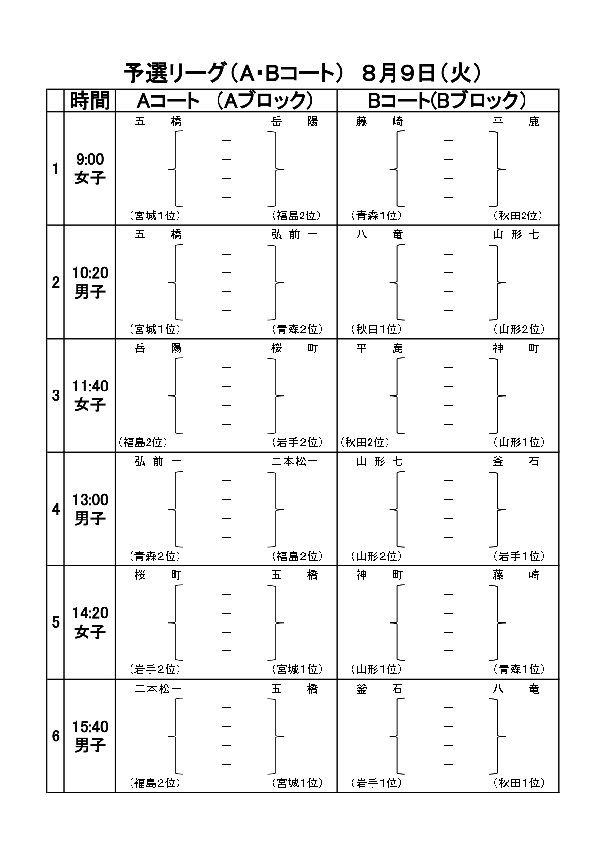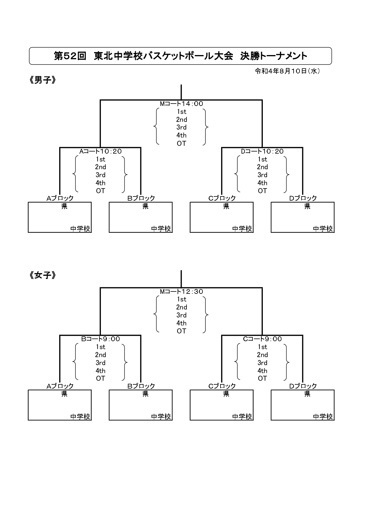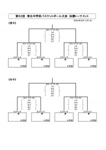 第52回東北中学校バスケットボール大会開催のお知らせ(8/8) 投稿者: hoophall2022/08/08お知らせ 令和4年度第52回東北中学校バスケットボール大会が8/9・10日、宮城県利府町のセキスイハイムスーパーアリーナで開催されます。男女各上位2チームが全国大会(北海道札幌市・8/20~23)に出場します。 男子は、能代山本地区の八竜中が秋田1位として出場します。 秋田県の出場校は以下のとおりです。 ◇男子 八竜中(秋田1位)、外旭川中(秋田2位) ◇女子 桜中(秋田1位)、平鹿中(秋田2位) 出場チームの皆さん、全国大会目指して頑張ってください! 【出場校と予選リーグ組み合わせ】 【予選リーグ日程】 【決勝トーナメント日程】