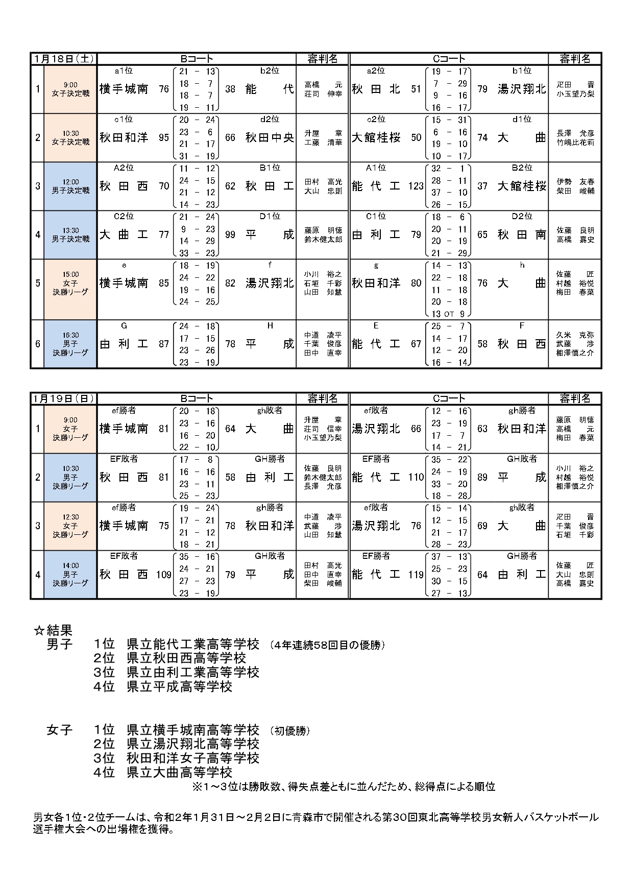 | 1位 | 能代工業高校 (4年連続58回目の優勝) |