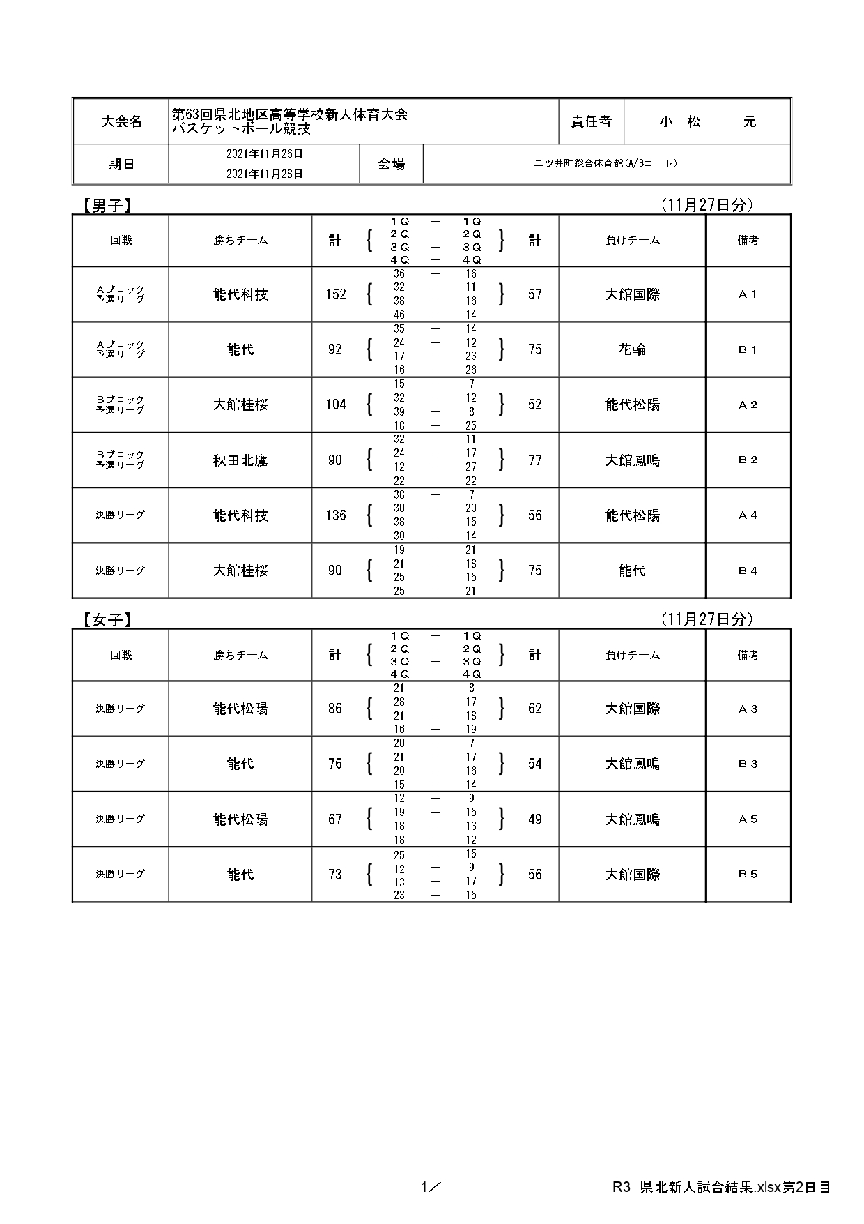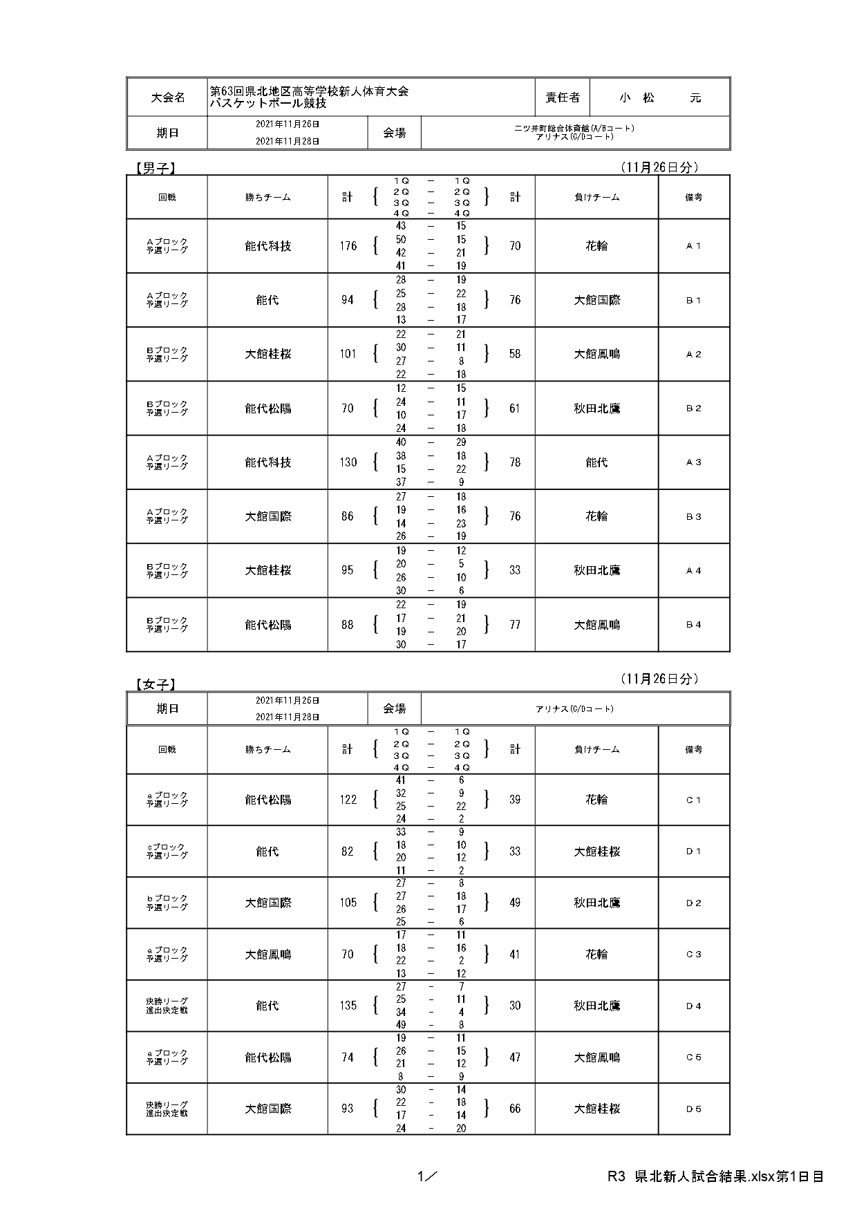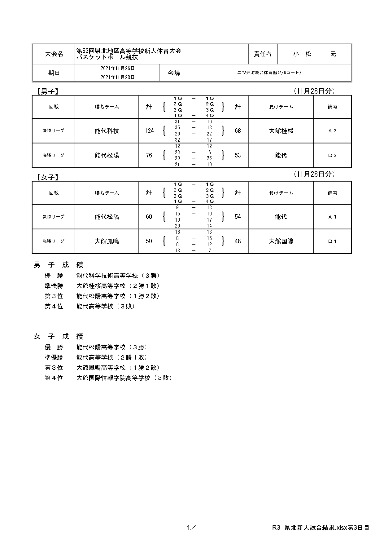 第63回県北地区高校新人バスケットボール大会が11月26日から28日まで、能代市の二ツ井体育館、アリナスで開催され、男子は能代科学技術、女子は能代松陽がそれぞれ優勝しました。
