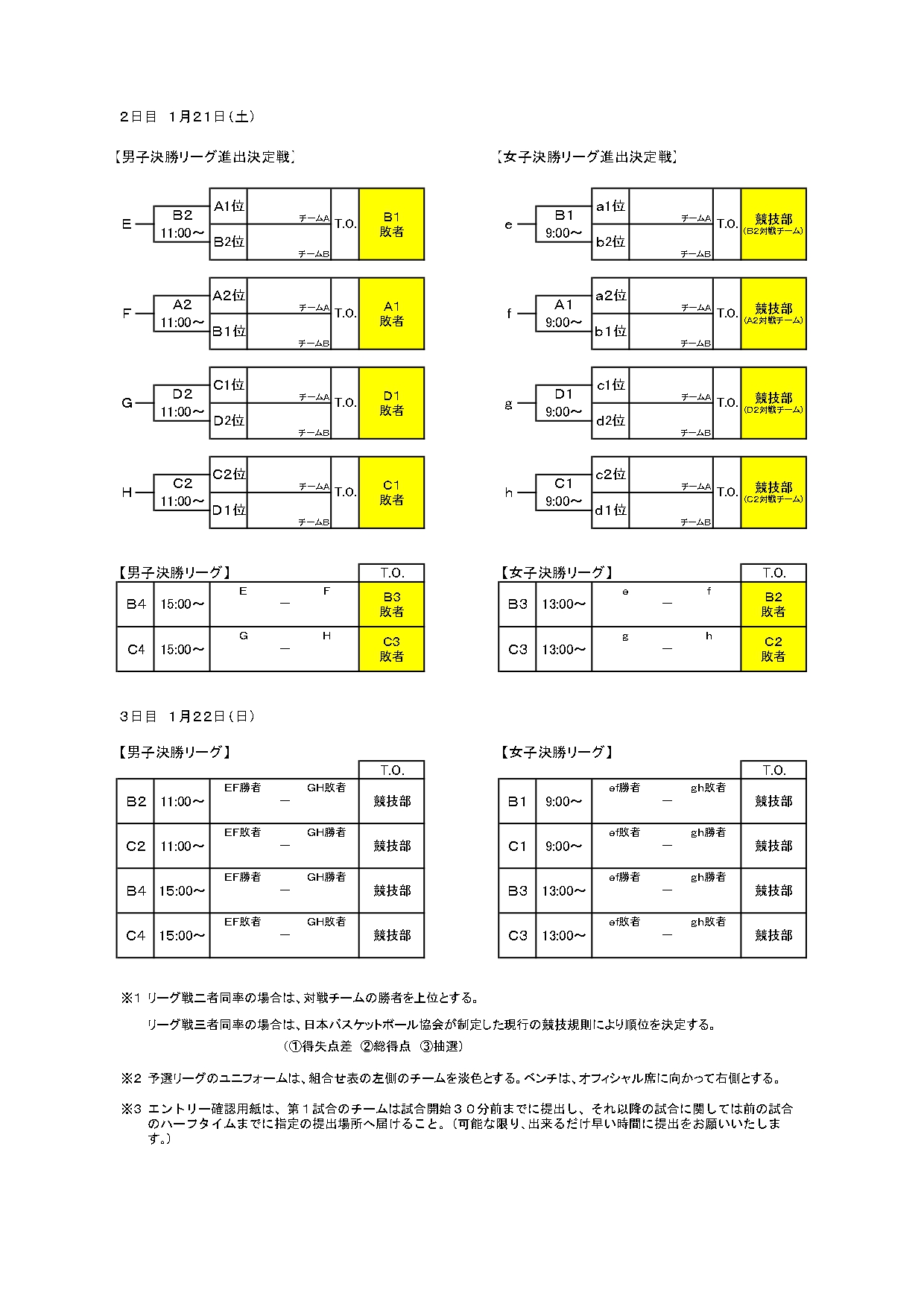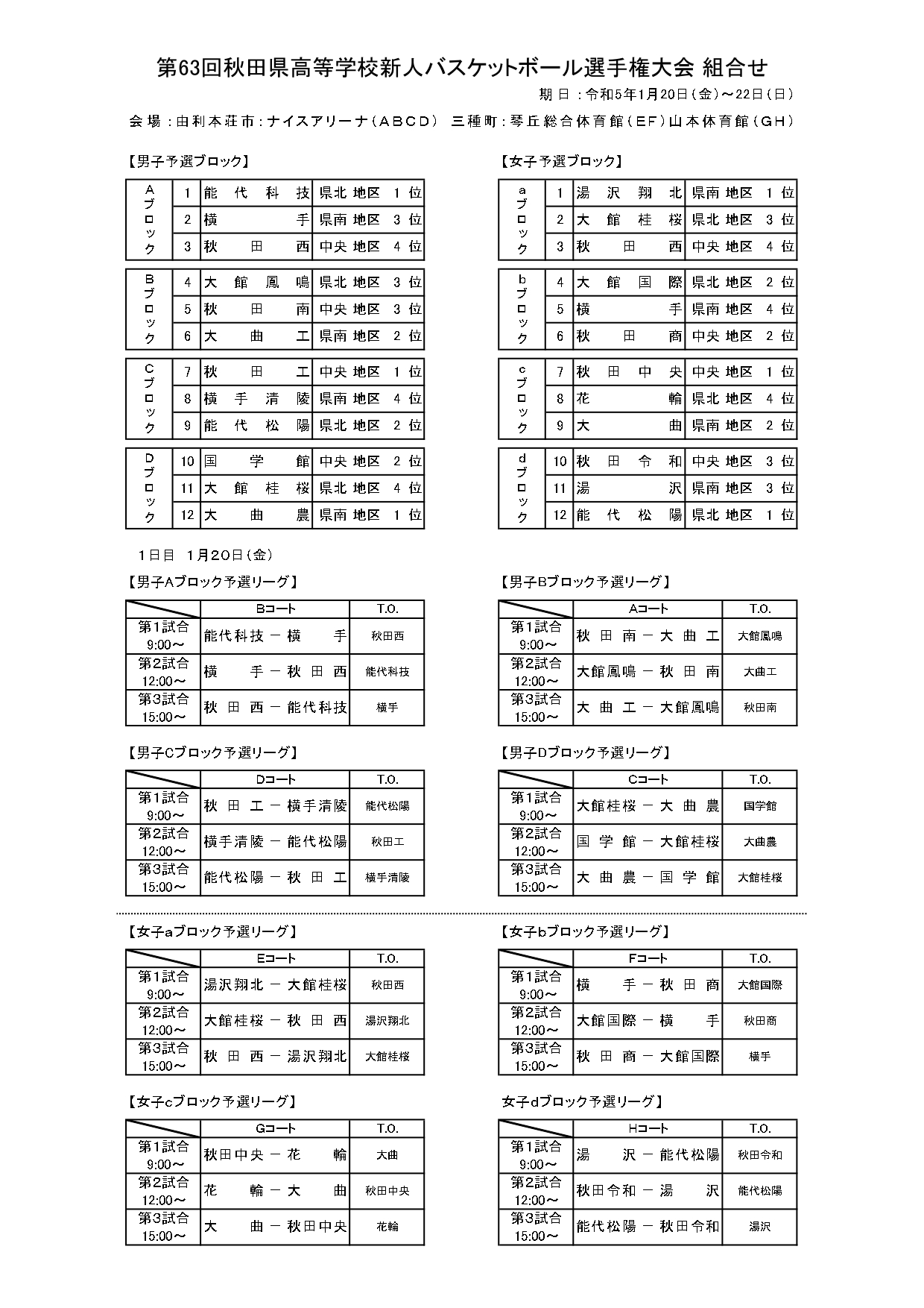 第64回秋田県高校男女新人バスケ組み合わせ(1/10) 投稿者: hoophall2023/01/102023/01/23お知らせ 第64回秋田県高校男女新人バスケットボール選手権大会が1/20日~22日まで、由利本荘市のナイスアリーナなどで開催されます。 能代市からは、男子が能代科技(県北地区1位)、能代松陽(同2位)、女子が能代松陽(県北地区1位)の3校が出場します。 なお、一般観客の観戦はできませんのでご了承ください。 組み合わせは以下のとおりです。