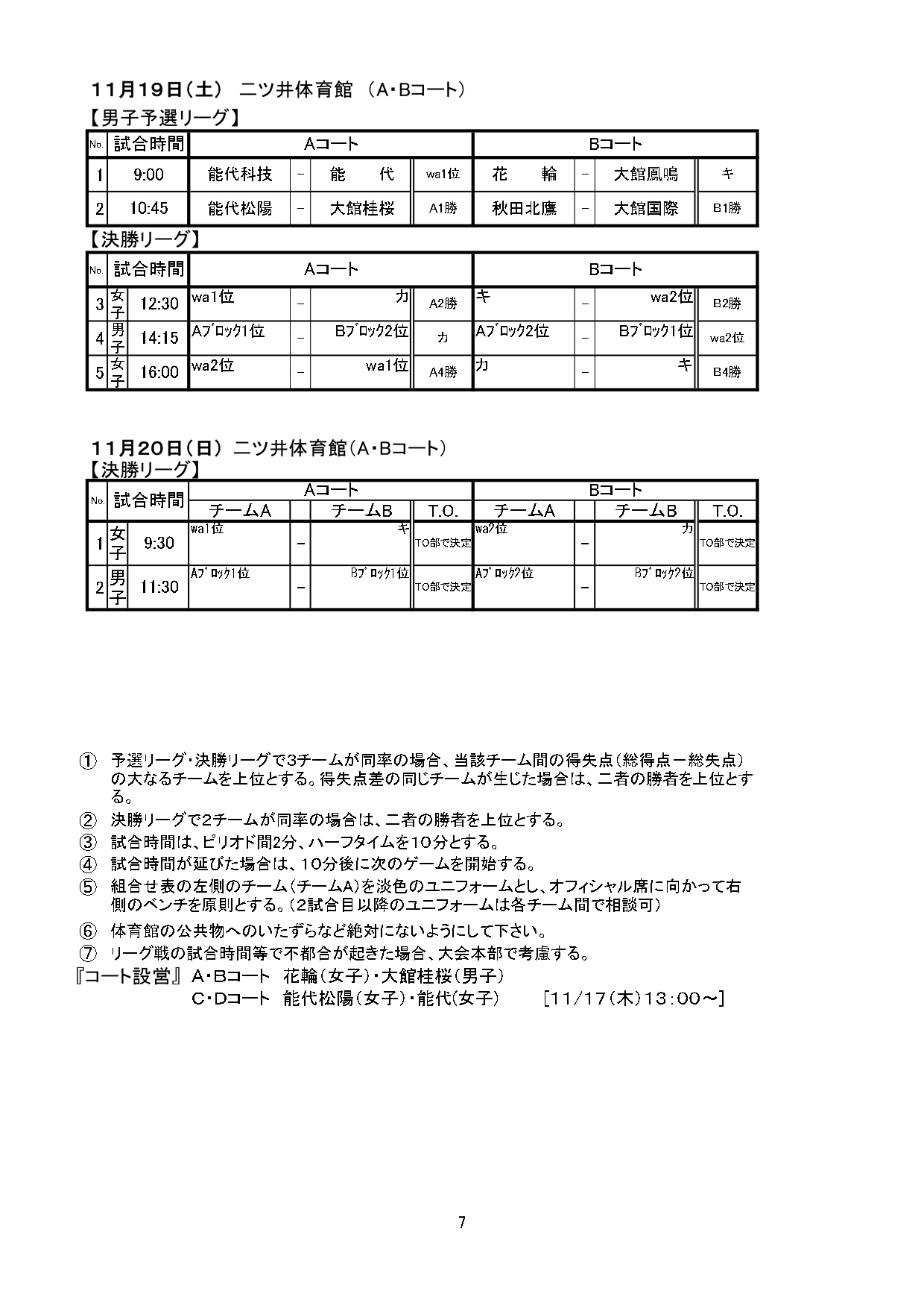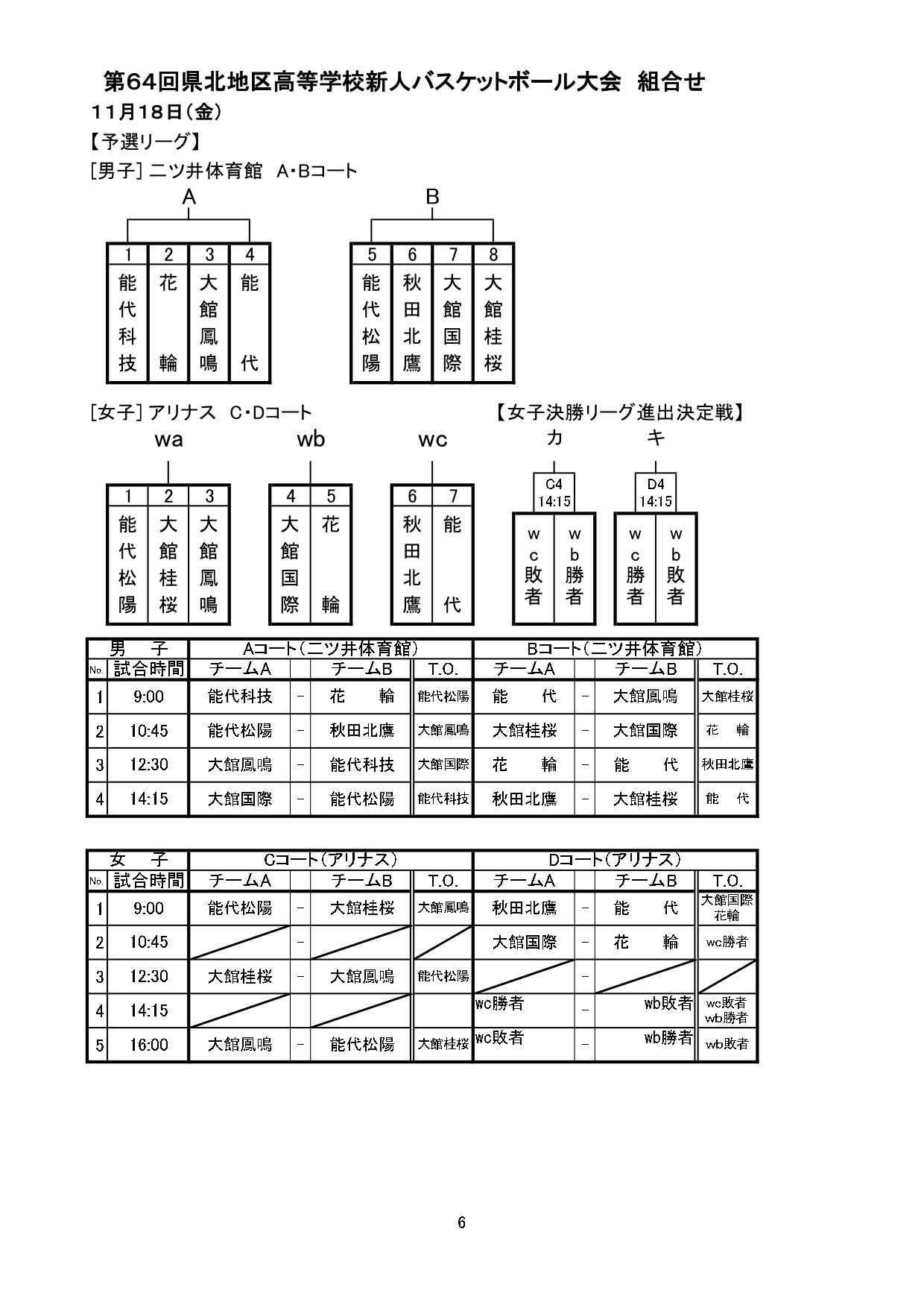 第64回県北地区高校新人バスケットボール大会組み合わせ(11/10) 投稿者: hoophall2022/11/10お知らせ 第64回県北地区高校新人バスケットボール大会が11/18~20日、能代市のアリナス・二ツ井町総合体育館で開催されます。 能代市からは、男子が能代科学技術・能代・能代松陽の3チーム、女子が能代松陽・能代の2チームが出場します。各チームの皆さん、頑張ってください! なお、新型コロナウイルス感染症対策のため、一般の方は観戦できません。 組み合わせは以下のとおりです。