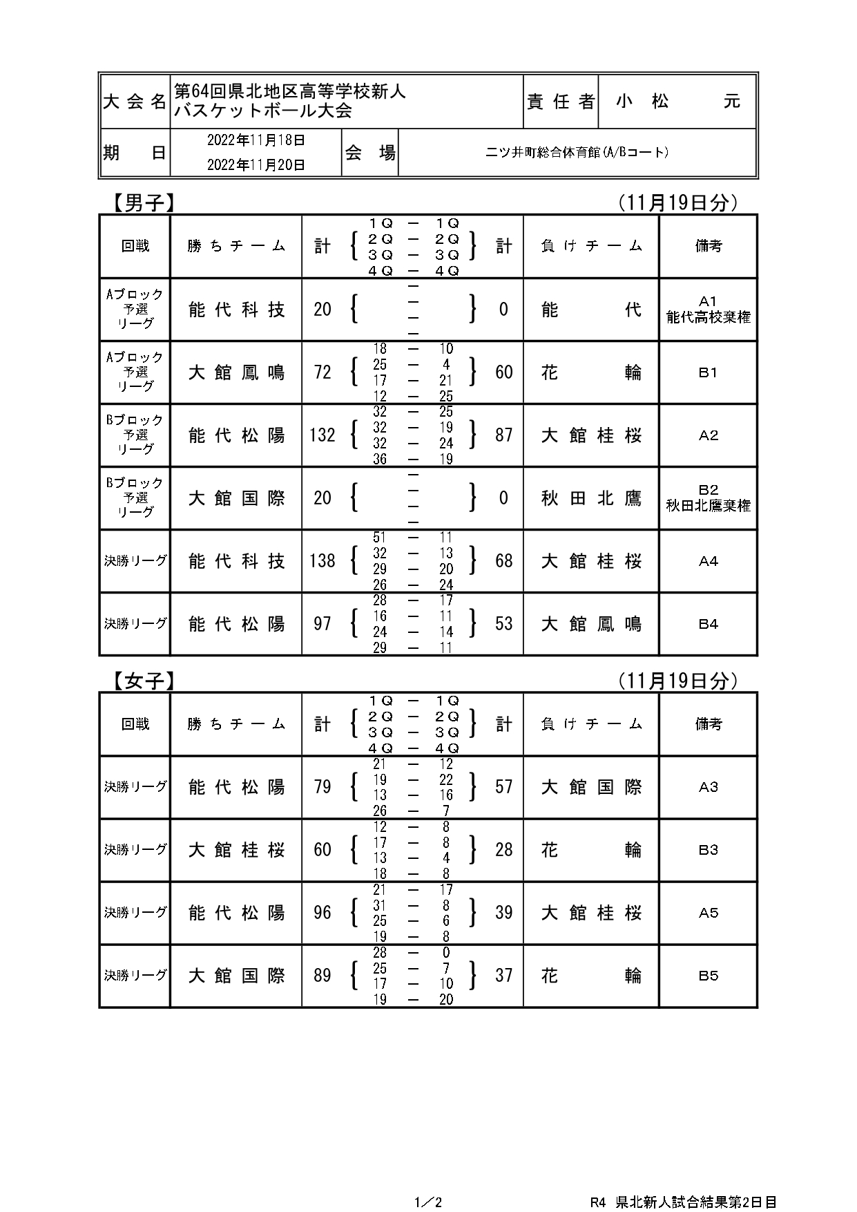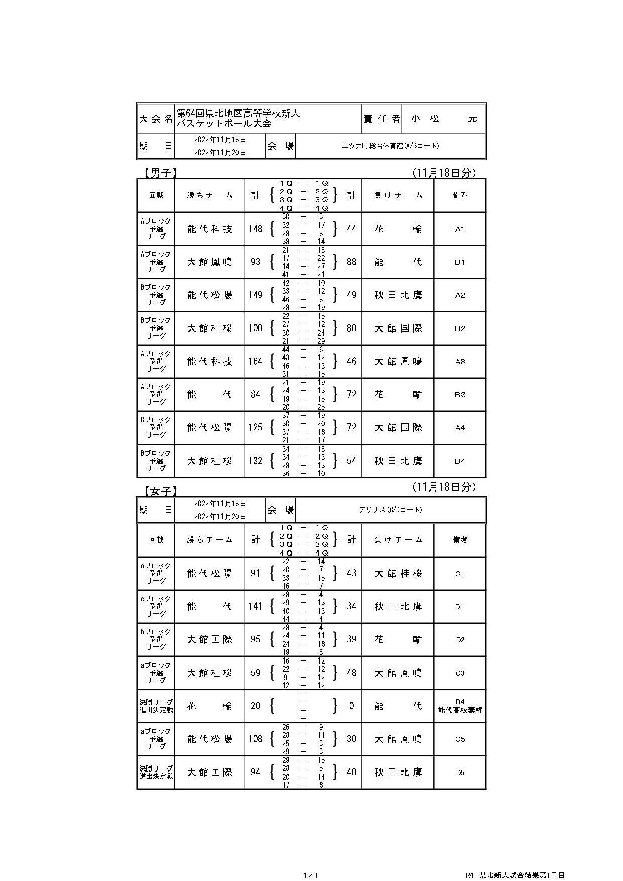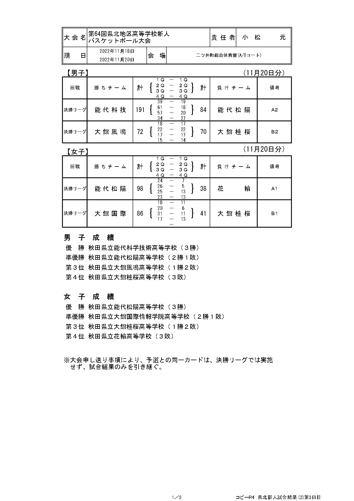 第64回県北地区高校新人バスケットボール大会が11/18~20日まで、能代市のアリナス・二ツ井町総合体育館で開催され、男子は能代科学技術、女子は能代松陽が優勝しました。