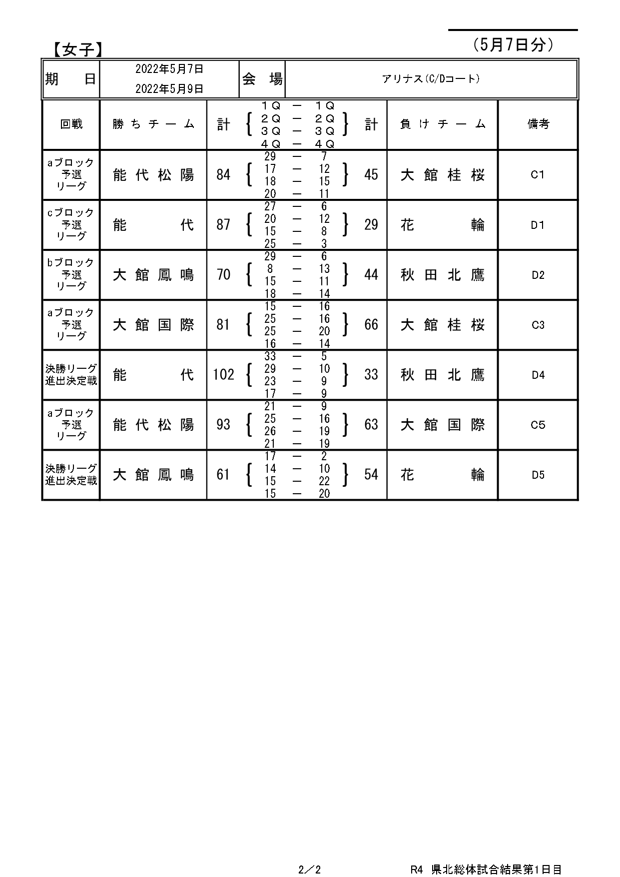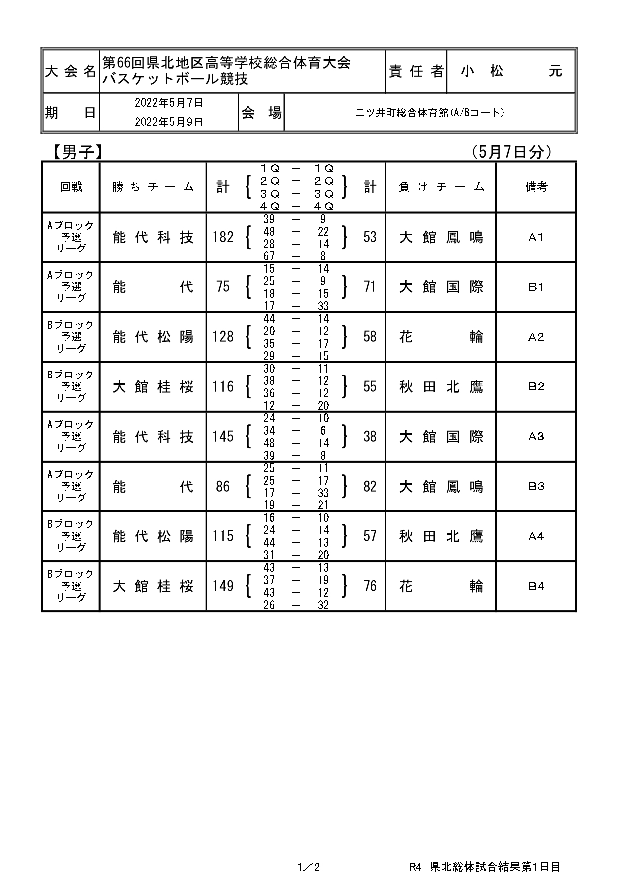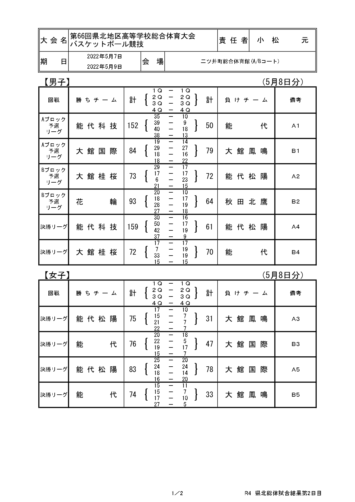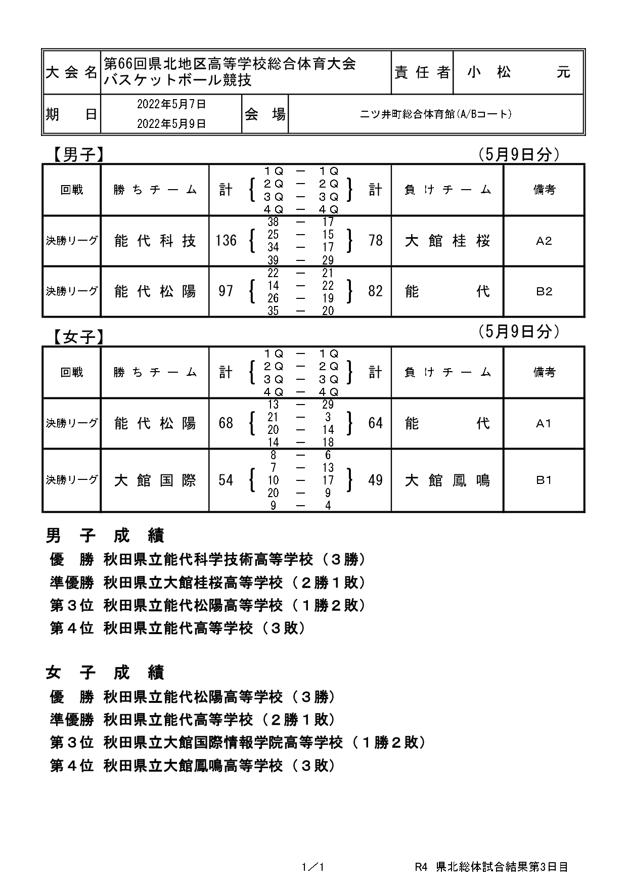 第66回県北地区高等学校総合体育大会が5/7から5/9までの3日間、能代市の二ツ井町総合体育館・アリナスで開催されました。男子は能代科学技術、女子は能代松陽が優勝しました。