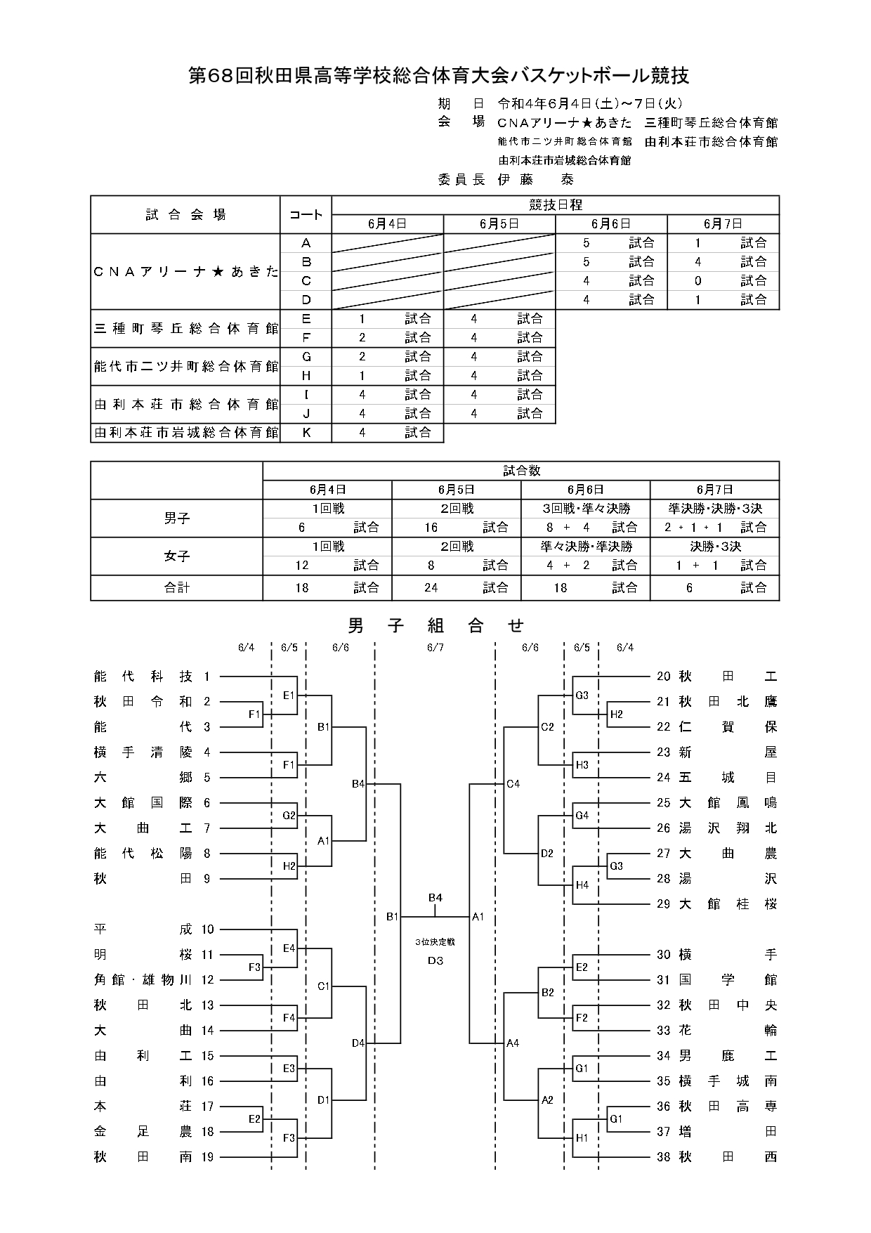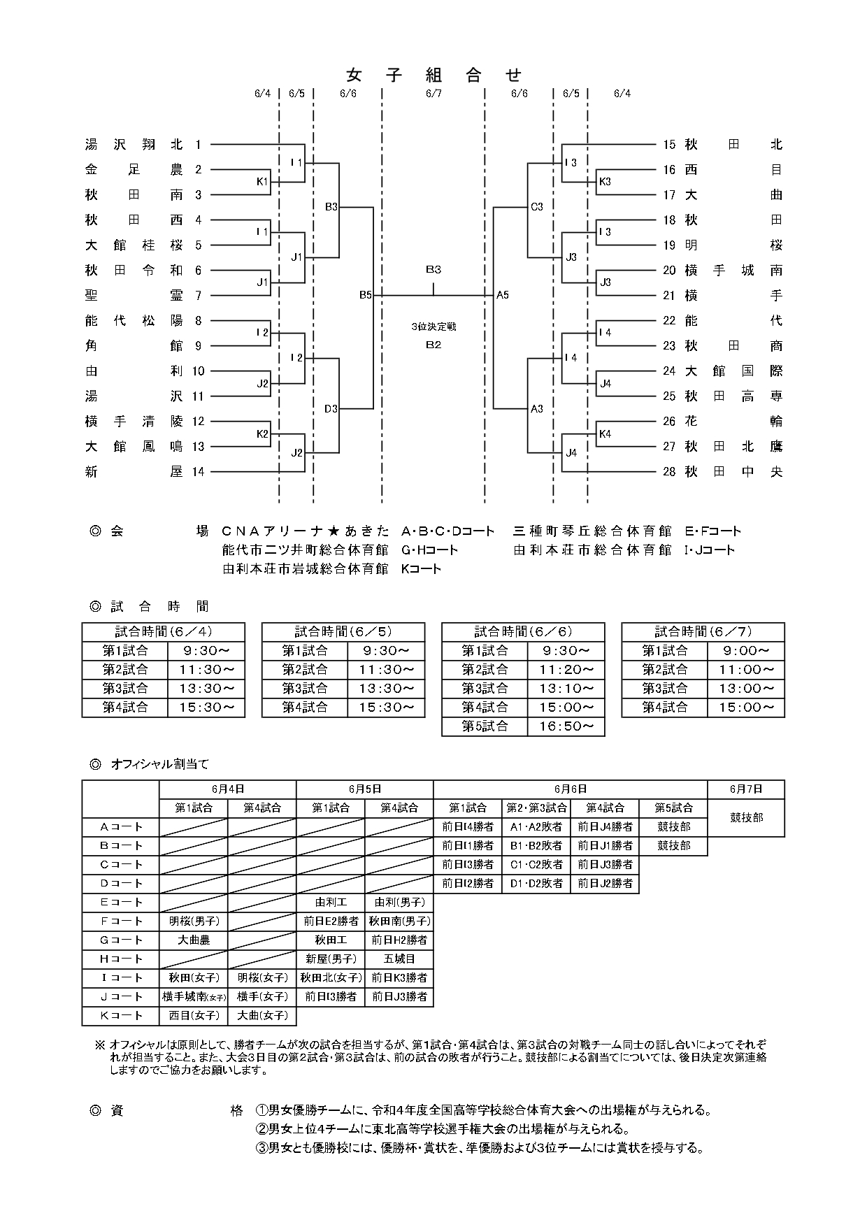 第68回秋田県高校総体開催のお知らせ(6/3) 投稿者: hoophall2022/06/03お知らせ インターハイ出場を懸けた第68回秋田県高校総合体育大会が6/4(土)~6/7(火)まで、秋田市のCNAアリーナ★あきた、三種町の琴丘総合体育館などで開催されます。男女優勝チームにインターハイ出場権が与えられるほか、上位4チームに東北大会出場権が与えられます。 能代市から、男子は能代科学技術、能代、能代松陽、女子は能代、能代松陽が出場します。 なお、新型コロナウィルス感染症拡大防止のため、一般観客の入場はできません。 組み合わせは以下のとおりです。