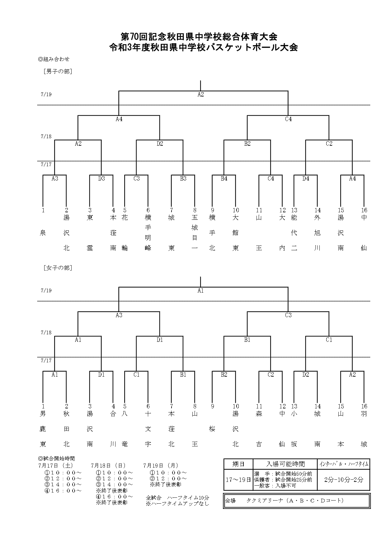 第70回秋田県中学校総合体育大会開催(7/17~19)のお知らせ 投稿者: hoophall2021/07/15お知らせ 第70回秋田県中学校総合体育大会が7月17~19日の3日間、大館市のタクミアリーナ(大館樹海体育館)で開催されます。 能代市からは、男子・東雲中、能代二中が出場します。両チームの皆さん、頑張ってください! なお、今大会は、新型コロナウイルス感染拡大防止のため、無観客試合となります。保護者以外の観戦はできませんので、ご注意ください。 組み合わせは以下のとおりです。 詳細は秋田県バスケットボール協会公式サイトをご覧ください。