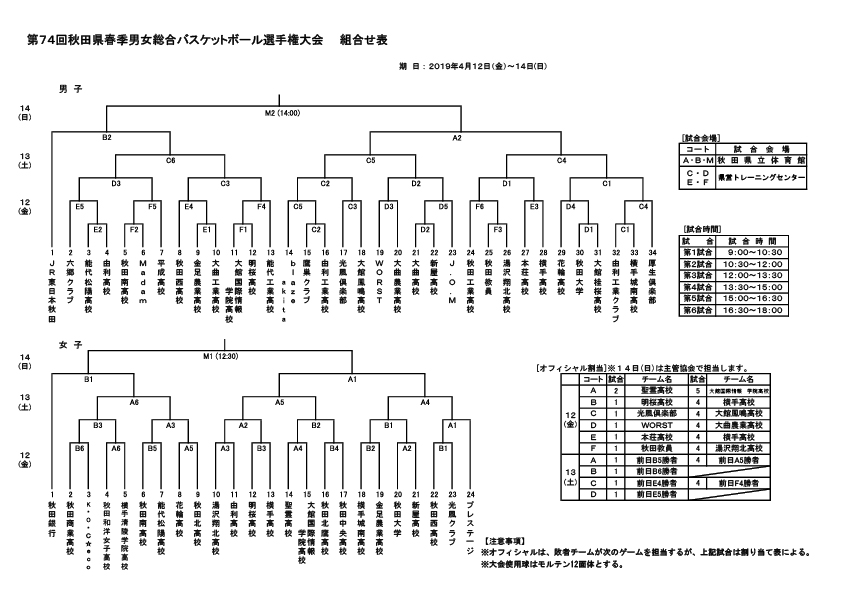 第74回秋田県男女総合バスケットボール選手権大会兼第95回天皇杯・第86回皇后杯全日本バスケットボール選手権大会秋田県代表決定戦のお知らせ(4/12・13・14) 投稿者: admin2019/04/02お知らせ 第74回秋田県男女総合バスケットボール選手権大会兼第95回天皇杯・第86回皇后杯全日本バスケットボール選手権大会秋田県代表決定戦が2019年4月12・13・14日の3日間、秋田県立体育館・県営トレーニングセンターで開催される事となりました。 能代市からは男子:能代工業高校・能代松陽高校が、女子:能代松陽高校が出場致します。 大会の組み合わせは下記組み合わせの通りとなっております。 詳細は秋田県バスケットボール協会のHPをご覧ください。