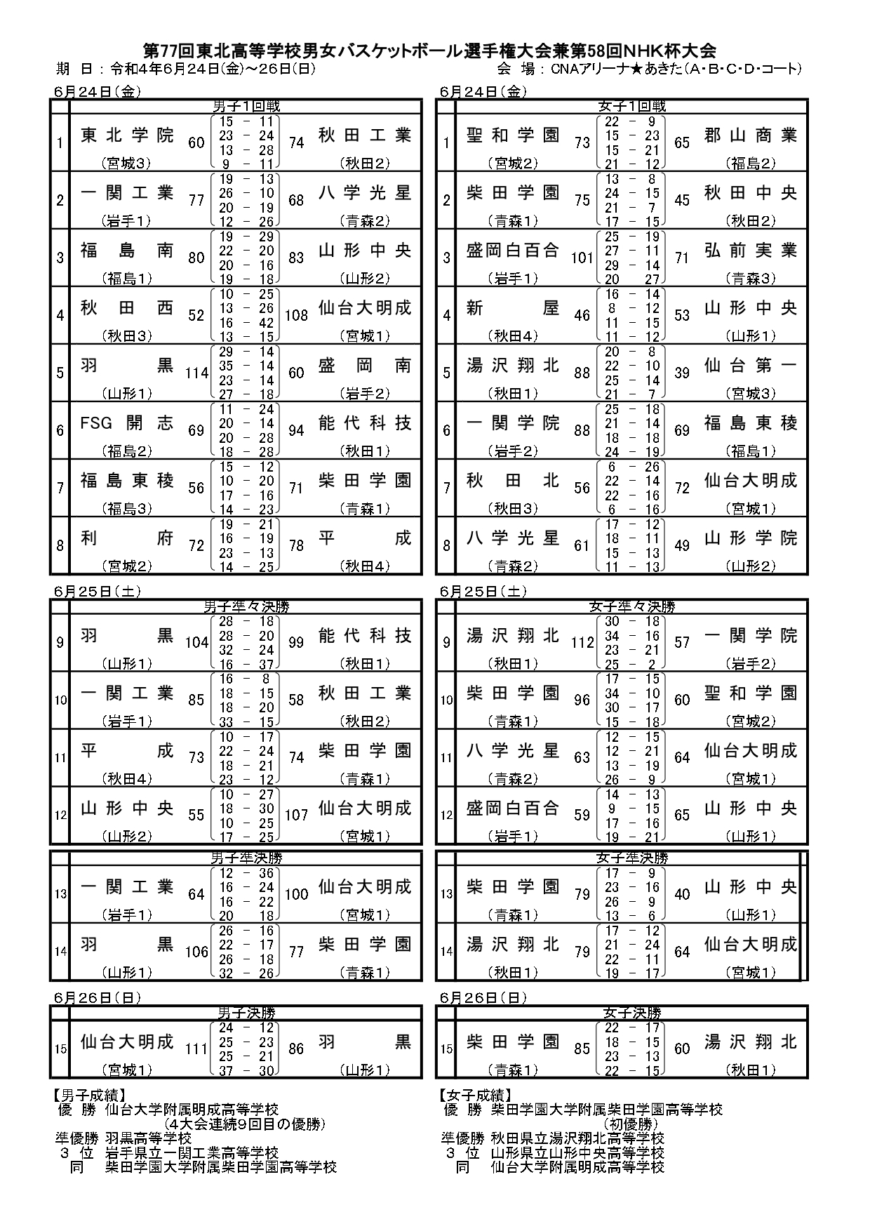 第77回東北高校選手権結果(6/27) 投稿者: hoophall2022/06/27お知らせ 第77回東北高等学校男女バスケットボール選手権大会兼第58回NHK杯が6/24~6/26まで、秋田市のCNAアリーナ★あきたで開催され、男子は仙台大学附属明成高校(4大会連続9回目)、女子は柴田学園大学附属柴田学園高校(初優勝)がそれぞれ優勝しました。 能代科学技術(秋田1位)は、準々決勝で羽黒(山形1位)に104-99で敗れ、上位進出はなりませんでした。 試合結果は以下のとおりです。 準決勝のボックススコアと決勝の戦評は秋田県高体連バスケットボール専門部特設サイトでご覧になれます。
