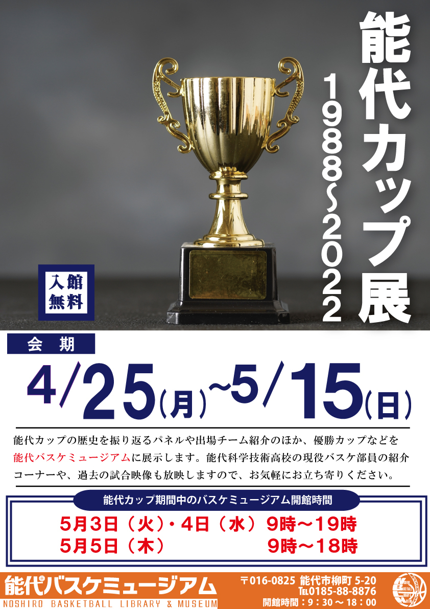 第35回能代カップ高校選抜バスケットボール大会(5/3~5/5)の開催に伴って、能代バスケミュージアムでは4/25~5/15まで「能代カップ展-1988~2022-」を開催します。