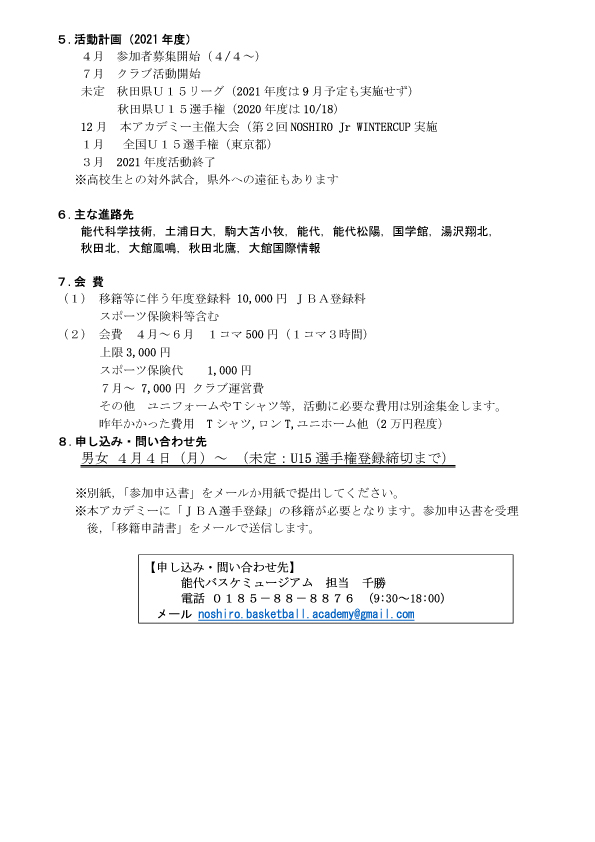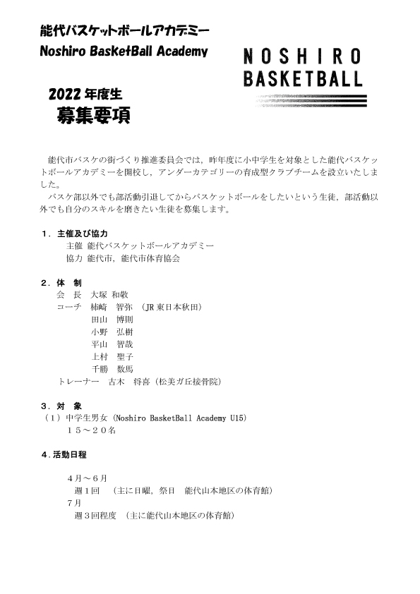 能代バスケットボールアカデミー2022年度生募集中! 投稿者: hoophall2022/04/142022/04/14お知らせ 「能代バスケットボールアカデミー」では、2022年度の受講生を募集しています。 お申込み希望の方はアカデミー申込用紙をダウンロードして、下記のいずれかの方法でお申し込みお願いします。 ●メールに添付し募集要項のアドレスに送る。 ●能代バスケミュージアム(能代市柳町5-20 9時半~18時)にご持参いただく。 ●FAX(0185-88-8875)で送る。