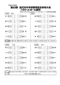 能代市中学校春季大会の結果(4/22~23) 投稿者: hoophall2017/04/25お知らせ 2017年4月22日(土)から23日(日)に二ツ井町総合体育館で開催された第65回能代市中学校春季総合体育大会の結果をお知らせします。 優勝した男子東雲中学校、女子能代二中は5月20日(土)~21日(日)に横手市で開催される春季全県大会に出場します。 能代勢のご健闘をお祈りします。 詳しくは能代市山本郡バスケットボール協会HPをご覧ください。
