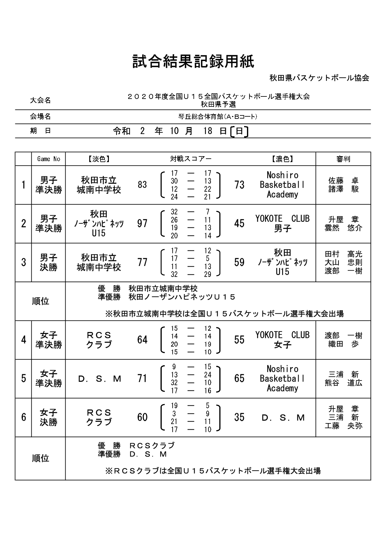 2020年10月18日(日)に三種町琴丘総合体育館で開催された2020年度 全国U15バスケットボール選手権大会 秋田県予選の結果をお知らせします。
