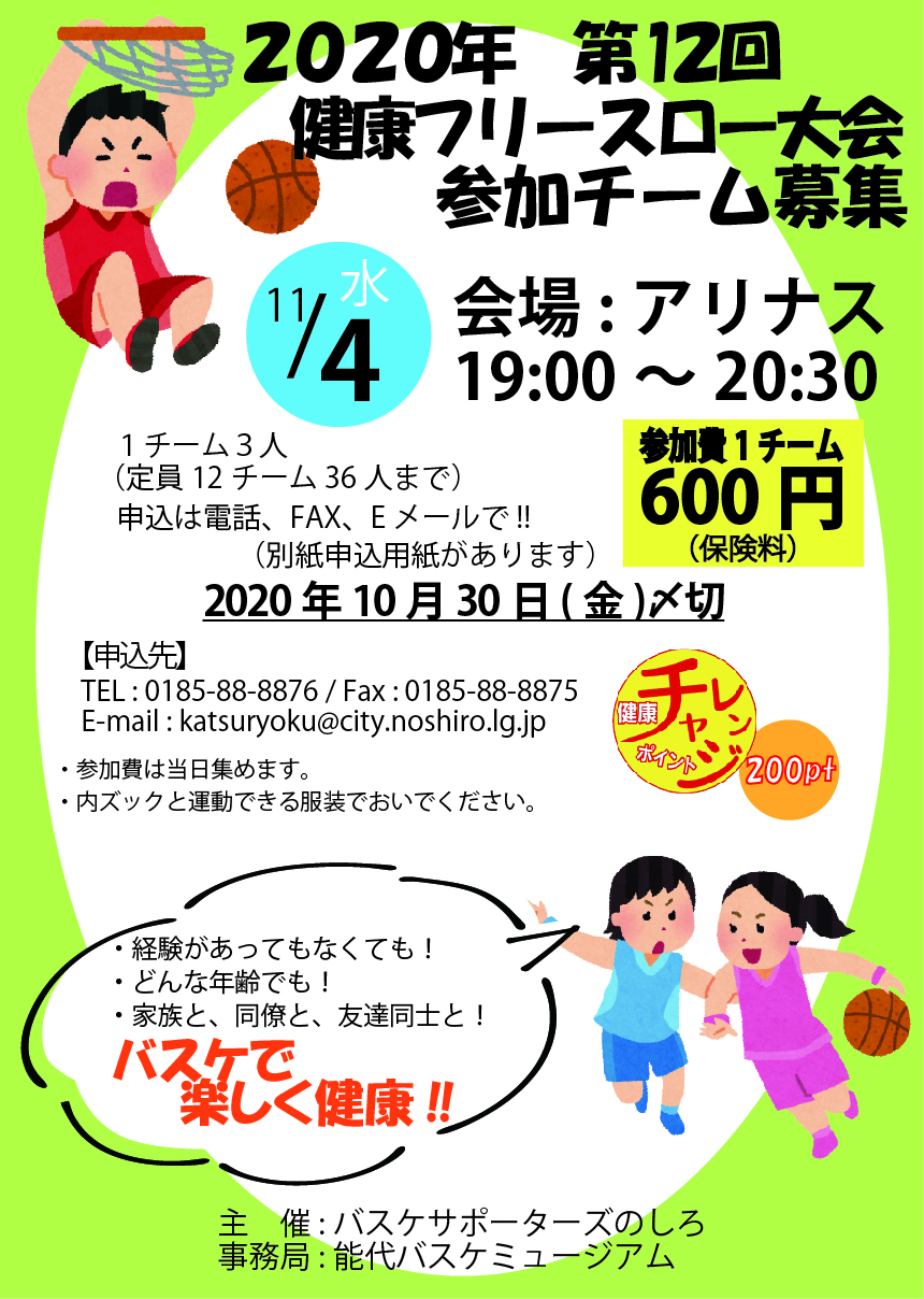 2020年第12回健康フリースロー大会のお申込み(~10/30) 投稿者: admin2020/10/282020/10/28お知らせ 現在、11月4日(水)に開催される健康フリースロー大会の参加チームを募集しています! 募集期限は10月30日(金)までとなっておりますので、希望される方は期限内のお申し込みをお忘れなく! 参加申込書は下記リンク先からダウンロードできます。 ○能代市HP「健康フリースロー大会参加チーム募集」