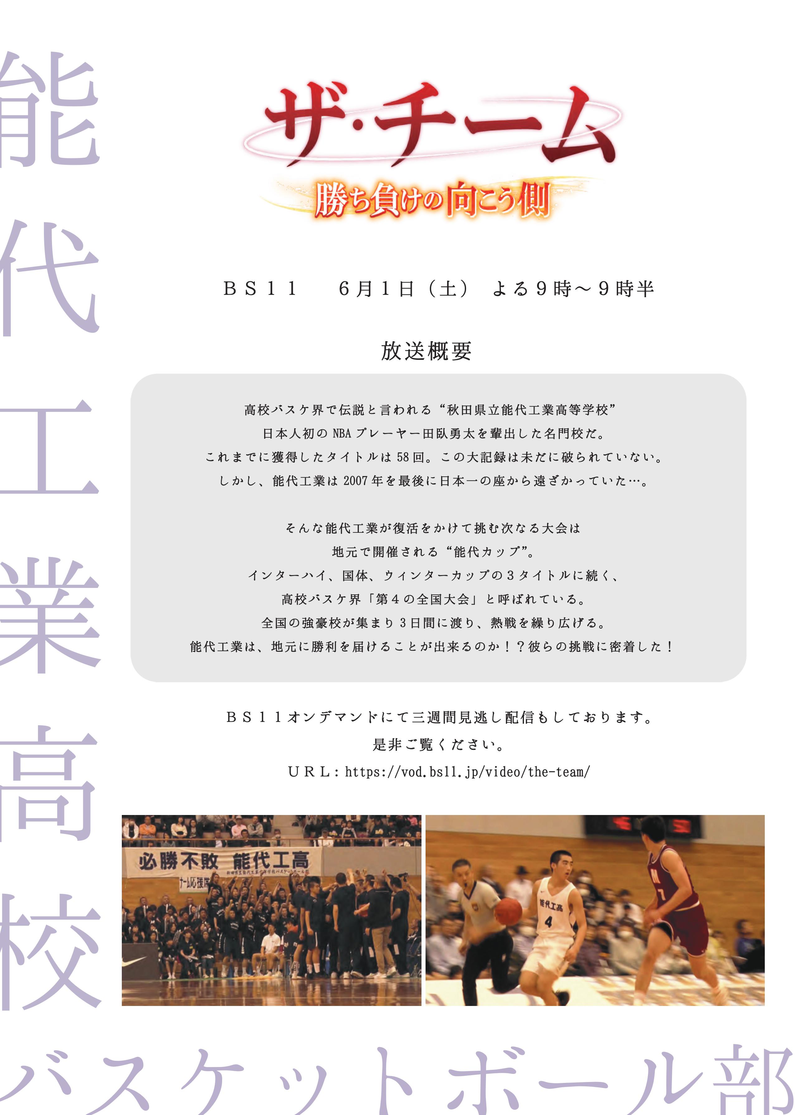 「ザ・チーム 勝ち負けの向こう側」6/1(土)21:00~21:30 BS11にて放送 投稿者: admin2019/05/312019/05/31お知らせ BS11にて、能代工業高校バスケットボール部に密着取材した「ザ・チーム 勝ち負けの向こう側」が6月1日(土)21:00~21:30放送されます。 BS11オンデマンドにて3週間見逃し配信もされるそうです。お見逃しなく!
