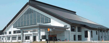 能代市二ツ井地区の生涯スポーツの中心施設として2005年に開館。メインアリーナとサブアリーナは、それぞれバスケットコートが2面ずつ取れるほか、トレーニングルームも完備しています。屋根部分は「木都能代」を象徴する秋田杉の大断面集成材が使用されています。